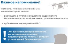 БПЛА һөҗүме очрагында пилотсыз очкычлар очышының видеоларын халыкка җиткерергә ярамый. Бу турыда кисәтүләр булып тора. Һәм һава һөҗүменә каршы оборона эшләү видеосын интернет киңлекләренә урнаштырмау мөһим. Бу аларның урнашу урыннарын ача һәм Татарстан Республикасы гражданнарының иминлегенә куркыныч тудыра.