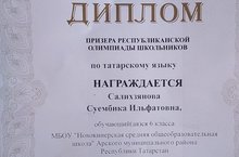Татар теленнән республика олимпиадасында катнашып Яңа Кенәр урта мәктәбенең 6А класс укучысы Салихова С. призер булды.Сөембикәне һәм татар теле укытучысы Габдрахманова И.М. чын күңелдән котлыйбыз,аларга киләчәктә уңышлар телибез.