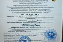 7 класс укучысы Сабирова Камилә Кукмара районы С.А.Ахтямов исемендәге Манзарас мәктәбендэ үткән "Память сердца" конференциясендә катнашып 2 урын алды.Камиләне һәм укытучысы Ахметова И.М. чын кңелдән котлыйбыз.