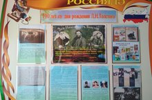 Лев Николаевич Толстойның тууына 190 ел. 22.01.2018 2017 елның 21 сентябрендәТатарстан Республикасы Президенты тарафыннан чыгарылган № УП-832 нче номерлы Указ нигезендә 2018 ел - Татарстан Республикасында бөек рус язучысы Лев Николаевич Толстой елы дип игълан ителде. Еллык Лев Николаеич Толстойның тууына 190 яшь тулу уңаеннан һәм Толстойлар гаиләсенең Казан белән бәйле тыгыз элемтәләрен, аның дөнья әдәбиятыннан керткән зур өлешен исәпкә алып үткәрелә. Шул уңайдан мәктәптә укучылар бөек язучының тормышы һәм иҗаты турында материал туплау, әсәрләр уку белән беррәттән, эчтәлекле стенд та булдырдылар.