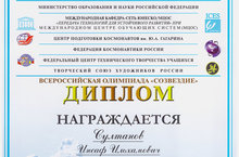 С18.04.2016.по 22.04.2016 в городах Королев и Звездный городок Московской области проходит финальная конференция семьнадцатой всероссийской олимпиады «СОЗВЕЗДИЕ-2016» научно-исследовательских и учебно-исследовательских проектов детей и молодежи по проблемам защиты окружающей среды «Человек – Земля – Космос».В этой конференции, в составе Татарстанской делегации участвует победивший в Республиканском туре учащийся 9класса Султанов Инсаф со своим проектом “Модель Солнечной электростанции” в номинации “Человек-Земля-Космос”.В программе конференции :экскурсии в Центр управления полетами,-ракетно-комический комлекс “Энергия”,-музей Космонавтики,музей Военно-воздушных сил, прямое общение с экипажом МКС ,встреча с космонавтами и защита пректов. Желаем Инсафу успехов.