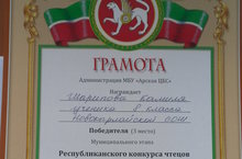6 февраля в МБУ “Арская ЦБС” прошел муниципальный этап Республиканского конкурса чтецов «Во имя мира на земле» , посвященный 70-летию Великой Победы. И наши ученики Гайфуллина Лилия (5кл.) и Рахимова Динара (5 кл.) получили Благодарственное письмо за активное участие, а ученик 8 класса Шарипов Камиль занял 3 место в этом конкурсе. Поздравляем! Желаем здоровья , творческих успехов и стать настоящим патриотом своей Родины!