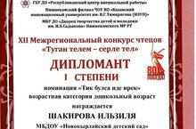 "Туган телем - серле тел!" конкурсында катнашып, Шакирова Язилә, Шакирова Илзилә, Сабирова Мәдинә призлы урыннарга лаек булдылар. 26.02.2025