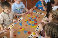 «За живой водой». Цель: формировать у детей представление о художественном образе, знакомить с таинством рождения образа через эффект соучастия в творческом процессе его художественного создания. Побуждать детей устанавливать сходство между разными геометрическими формами и предметами и путем дорисовки получать цельное изображение героев любимых сказок, используя разнообразие цветовых оттенков. Предварительная работа: чтение сказок, рассматривание в них иллюстраций, смешивание красок для получения всех оттенков, закрепление названия геометрических форм в играх «Чего не хватает», «Сложи сам», «Собери по цвету». Материал к занятию: волшебная палочка, магнитофонная запись, 2 картины: Р. Г. Уутмаа «Ночное море» и Н. М. Ромадина «Розовая вода», 2 скамейки, листы с геометрическими цветными формами, простые карандаши, гуашь, 12 банок для воды, по 2 кисточки (тонкая и толстая) на каждого ребенка, палитра на каждого, 12 тряпочек, 6 подставок. 13.09.2016