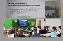 Крым-Россия! 18 марта в нашей стране отмечается важный праздник - День воссоединения Крыма с Россией. По этому поводу с учащимися 7 классов был проведён классный час.
