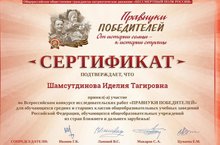 Правнуки победителей 13.05.2020 8 класс укучысы Шәмсетдинова Иделия "Правнуки победителей" Бөтенроссия тикшеренү-эзләнү эшләре конкурсында катнашты. Сертификатка ия булды.Молодец!