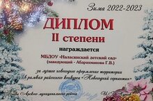 Безнең балалар бакчасы территорияне иң яхшы бизәгән "Новогодний серпантин" район конкурсында катнашып II дәрәҗә диплом һәм бүләк сертификаты белән бүләкләнде. Уртак хезмәт нәтиҗәбез.