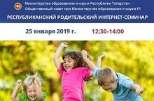 Во исполнение плана работы Министерства образования и науки Республики Татарстан 25.01.2019 с 12.30 до 14.00 состоится Республиканский родительский интернет-семинар ». Он-лайн трансляция собрания будет вестись на сайте Казанского инновационного университета имени В.Г.Тимирясова по адресу: https://ieml.ru/.