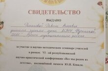 Рус теле һәм әдәбияты укытучысы Романова Р.Ә. VI нчы республикакүләм фәнни – гамәли конференция кысаларында оештырылган укытучыларның фәнни – методик семинарында катнашып, уңышлы чыгыш ясады.