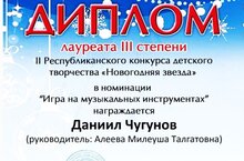 Обучающийся музыкального отделения по специальности "классическая гитара" Детской школы искусств Чугунов Даниил стал лауреатом III степени во II Республиканском конкурсе детского творчества "Новогодняя звезда" в г. Мамадыш. Молодец! Класс преподавателя Алеевой М.Т. @amileusha