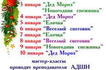 Новогодние мастер-классы для детей и взрослых будут проходить на стадионе в первом домике с 15.00 до 20.00 часов. Ждем вас с 3 января. Будем рады встрече с вами.