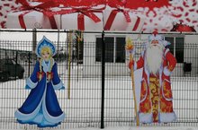 Дед Мороз со Снегурочкой встречают всех у входа в колледж.