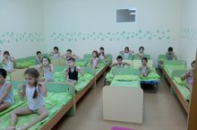 Гимнастика после сна играет большую роль в пробуждении ребенка. От этого зависит также и настроение ребенка. Сегодня в подготовительной группе №6 нашего детского сада педагоги наблюдали за процессом пробуждения детей, за гимнастикой после сна, за корригирующей гимнастикой. Гимнастика после сна была проведена в сочетании с другими оздоровительными процедурами: дыхательной гимнастикой и звуковой гимнастикой, профилактикой и коррекцией нарушения осанки, плоскостопия, упражнения для глаз, пальчиковой гимнастикой и самомассажа. Она была направлена на плавный переход ребенка от сна к пробуждению.