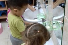 Несмотря на то, что дети маленькие, воспитатели младшей группы активно учат их правильно мыть руки, мыть лицо обеими руками прямыми и круговыми движениями. Воспитанники закрепляют умение правильно пользоваться своим полотенцем, вытирать лицо, затем руки.