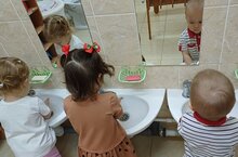 Воспитание у детей навыков личной гигиены играет важнейшую роль в охране их здоровья. Во 2 группе раннего возраста мы прививаем такие полезные привычки, как мытье рук, соблюдение режима дня, самостоятельное пользование горшком или унитазом, умение правильно держать ложку. К двум годам малыш может научиться умываться и причёсываться, снять шапочку или носочки, вытирать рот салфеткой после еды и сморкаться в носовой платочек. На первый взгляд всё очень просто, а на самом деле для малышей это целая наука-освоение и применение культурно-гигиенических навыков. Очень сложно научить детей умываться, пользоваться правильно полотенцем.Объясняем и показываем детям, что сначала надо намочить руки. Даём ребенку кусочек мыла, показываем, как намылить руки и как смыть мыло; затем мы учимся, как самостоятельно вытираться полотенцем. Вот так потихоньку мы учим малышей полезным привычкам.