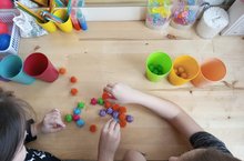 "Сортировка"Описание: на столе или полу разложите фигурки разных форм и размеров. Задача ребёнка — рассортировать все по цвету или форме.