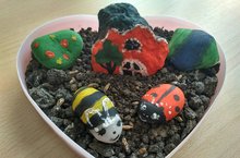 В средней группе №1 в течение недели воспитатели, дети и их родители обсуждали вопрос "Какие игрушки необходимы детям?" Пришли к одному мнению: самые лучшие игрушки те, которые сделаны своими руками. Вот и создали наши воспитанники композицию из каменных игрушек. Роспись камней развивает творческую фантазию и самовыражение. Такие же игрушки можно использовать для оформления участка детского сада в летний период.