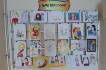 Наши воспитанники со своими родителями готовили рисунки к выставке "Портрет моей Мамы!". Они очень старались изобразить портреты своих любимых мам.