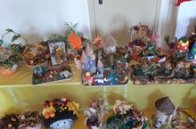 «Осень - это удивительное время года! Она очаровывает нас своими красками и вдохновляет нас на творчество. Наши воспитаннники ,вместе родителями, сделали своими руками чудесную выставку осенних поделок под названием "Осенняя пора-очей очарованье!". В ход пошли еловые шишки, жёлуди, сосновые и рябиновые ветки, яркие осенние листья. Все чудо поделки разместились в холле второго этажа нашего детского сада Теперь родители, педагоги, воспитанники могут с удовольствием насладиться великолепием осенних букетов и пейзажей из осенних листьев и рябины, плетёными корзиночками, ёжиком с сосновыми иголками и многими другими творениями