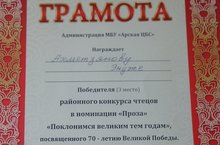 13 марта в Арской ЦБ прошел районный конкурс чтецов "Поклонимся тем годам", посвященный 70-летию Великой Победе. Ученица 9 класса Ахмедзянова Эндже заняла 3 место в номинации "Проза". Желаем ей творческих успехов!