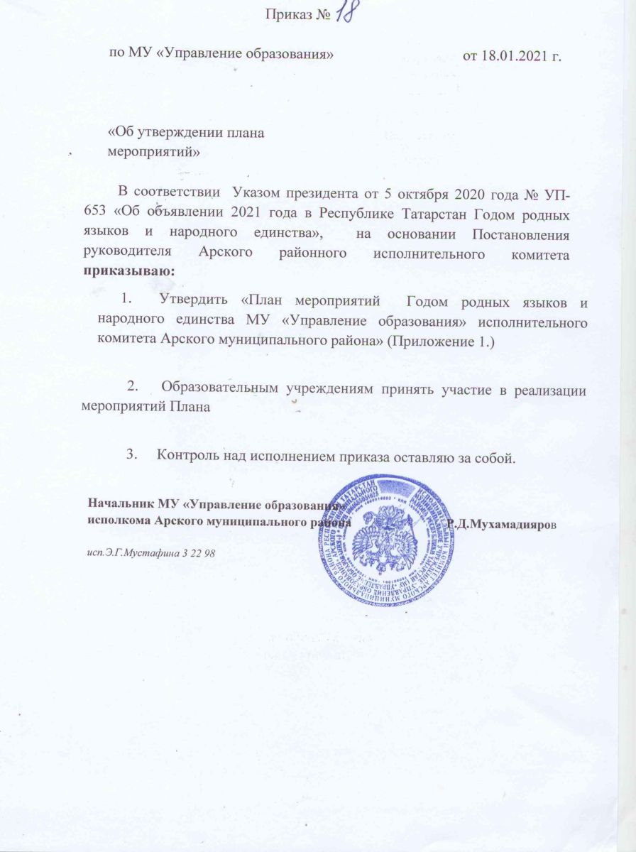 - Приказ МУ "Управление образования" Арского МР № 18 от 18.01.2021 "Об утверждении плана мероприятий"