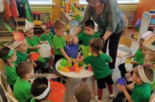 Утро в младшей группе "Сказка" началось с веселой гимнастики с флажками. В группе мы беседовали о полезных витаминах с нашего огорода и сада.Провели игру"Разложи в корзинки по цвету",тем самым повторили названия овощей и фруктов,цветовую гамму,закрепили знания о необходимости наличия витаминов в организме человека.