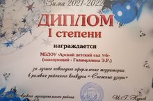 Бүген, 13 нче гыйнвар көнне, Арча үзәк стадионында Иске Яңа ел тамашасы тантаналы узды. Әлеге чарада район күләмендә оештырылган "Карлы бизәк" дип аталган бәйгедә җиңүче оешмаларны билгеләп үттеләр. Безнең 6 нчы "Сандугач" балалар бакчасы бу бәйгедә, Яңа елга иң яхшы бизәлгән территорияле оешма буларак җиңү яулады һәм 1 нче дәрәҗәдәге диплом белән бүләкләнде. Уңышлар дәвамлы булсын! Алга таба да коллектив һәм әти- әниләр бергә- бергә дус- тату булып, югары үрләр яуларга язсын!