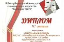 Өстәмә белем бирү педагогы Загидуллни Г.В. җитәкчелегендәге "Мәктәп театры" түгәрәгенә йөрүчеләр республика күләмендә уздырылган "Театр как театр" дип аталган конкурста 3 дәрәҗә дипломант булдылар. Аларны чын күңелдән җиңүләре белән котлыйбыз!