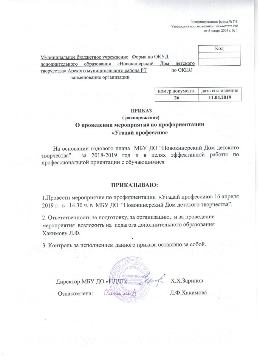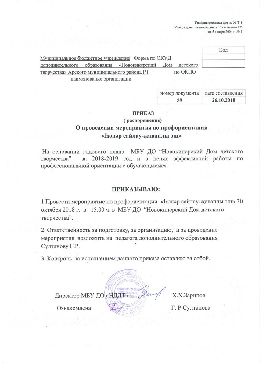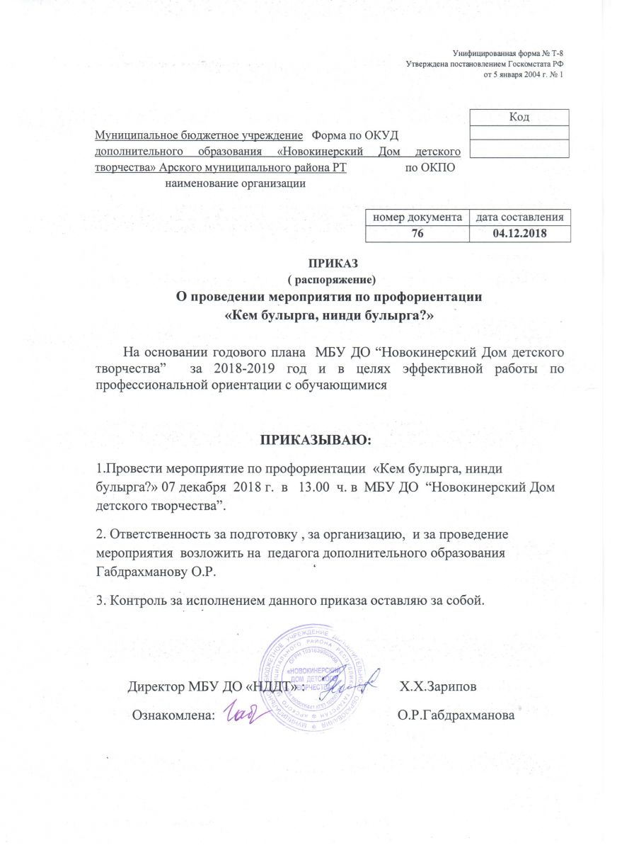 Приказ о проведении мероприятия "Һөнәр сайлау - җаваплы эш"