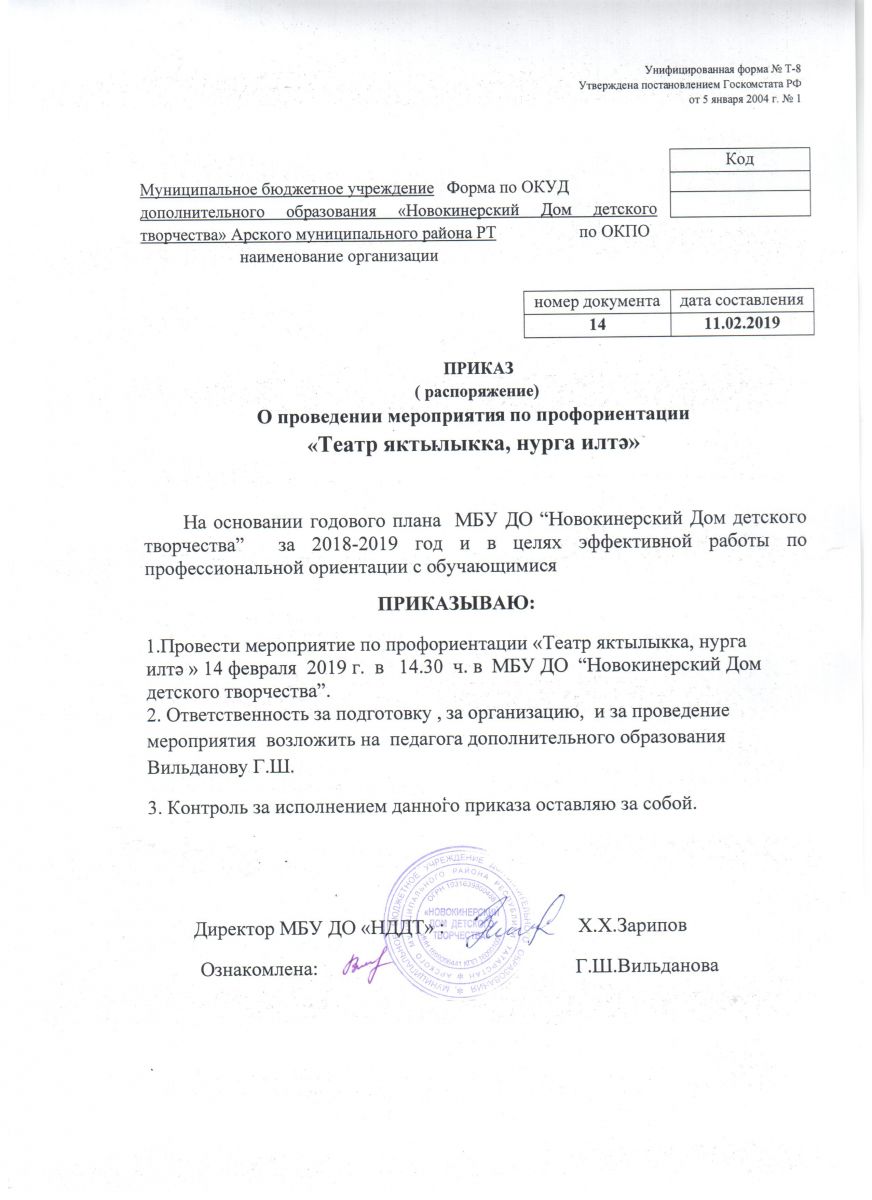 Приказ о проведении мероприятия "Театр яктылыкка, нурга илтә"