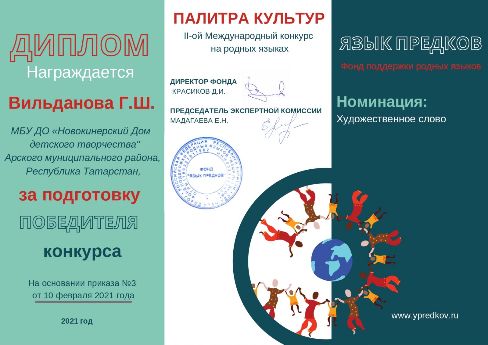 Диплом за подготовку победителя конкурса "Язык предков"