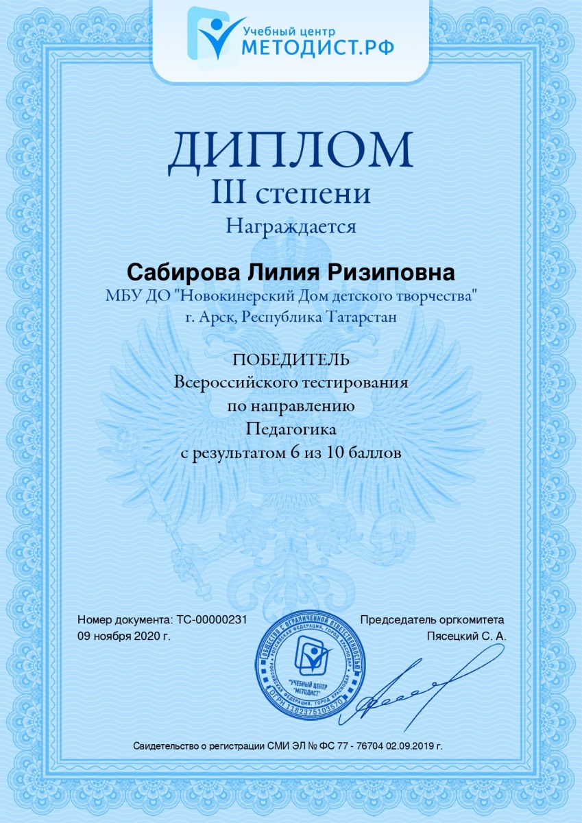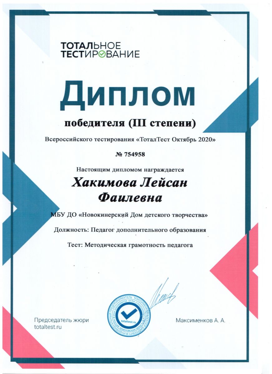 Диплом 3 степени - тестирования по направлению "Педагогика"