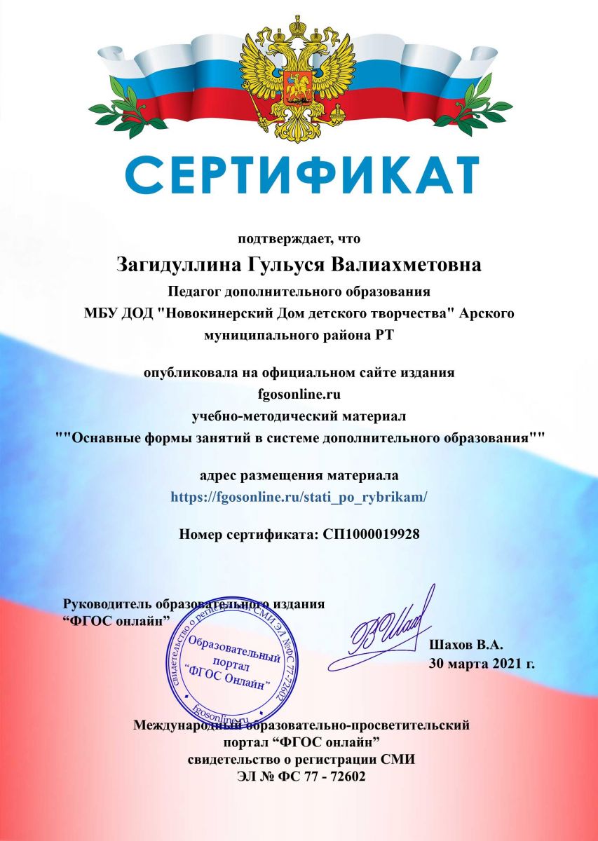 Сертификат "Основные формы занятий в системе дополнительного образования"