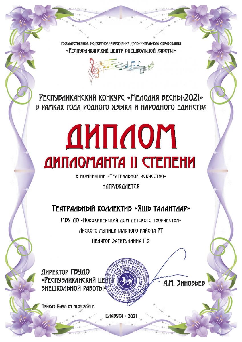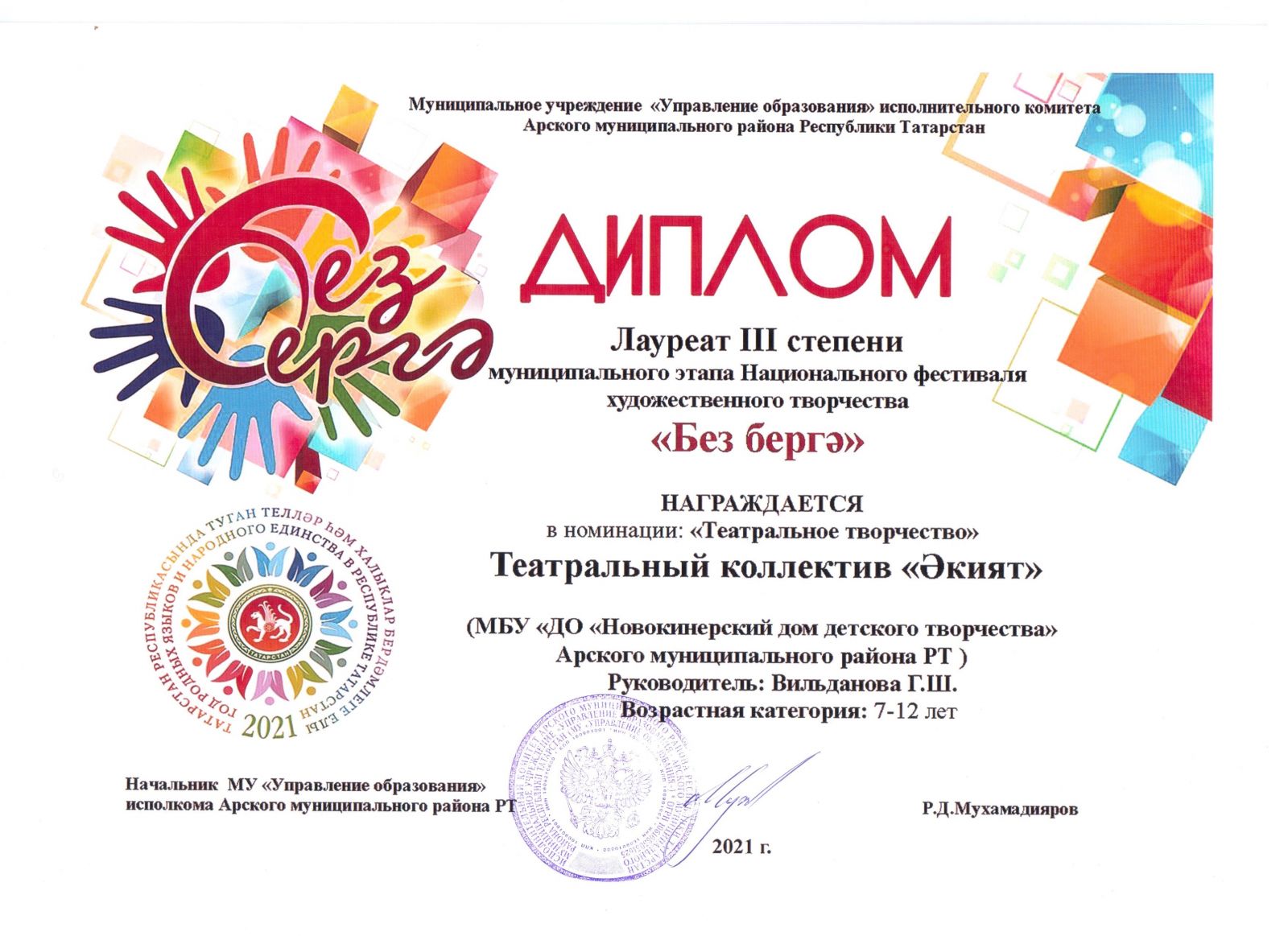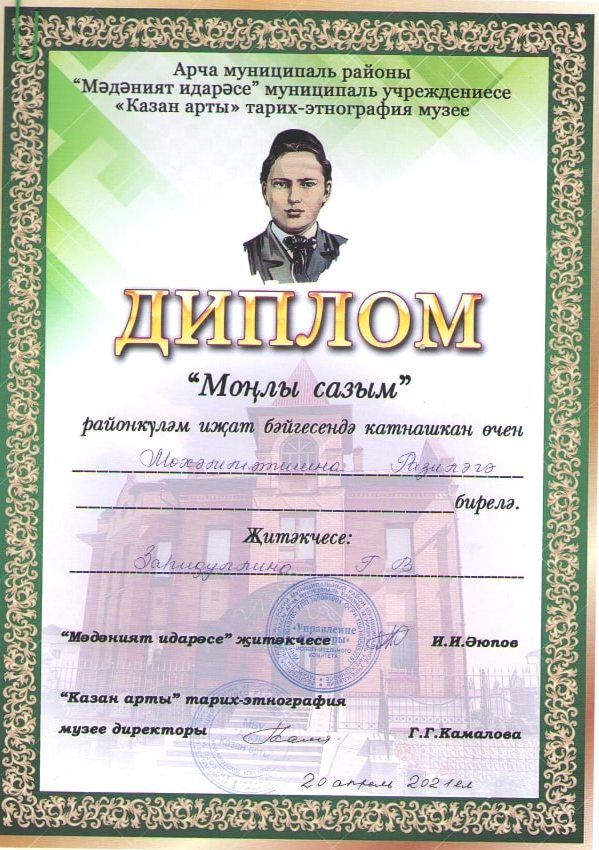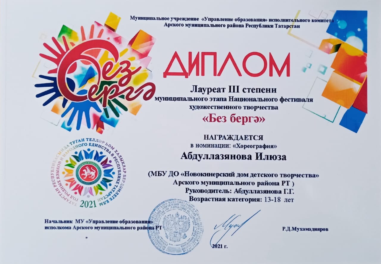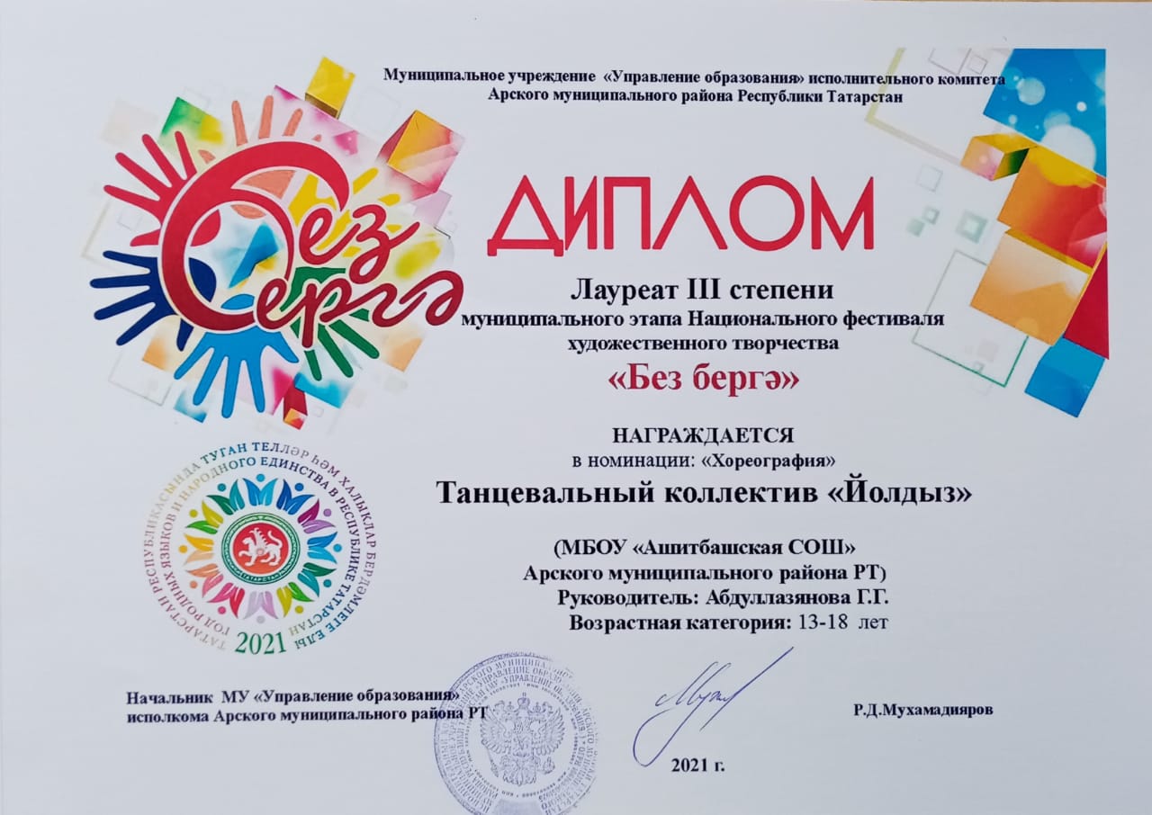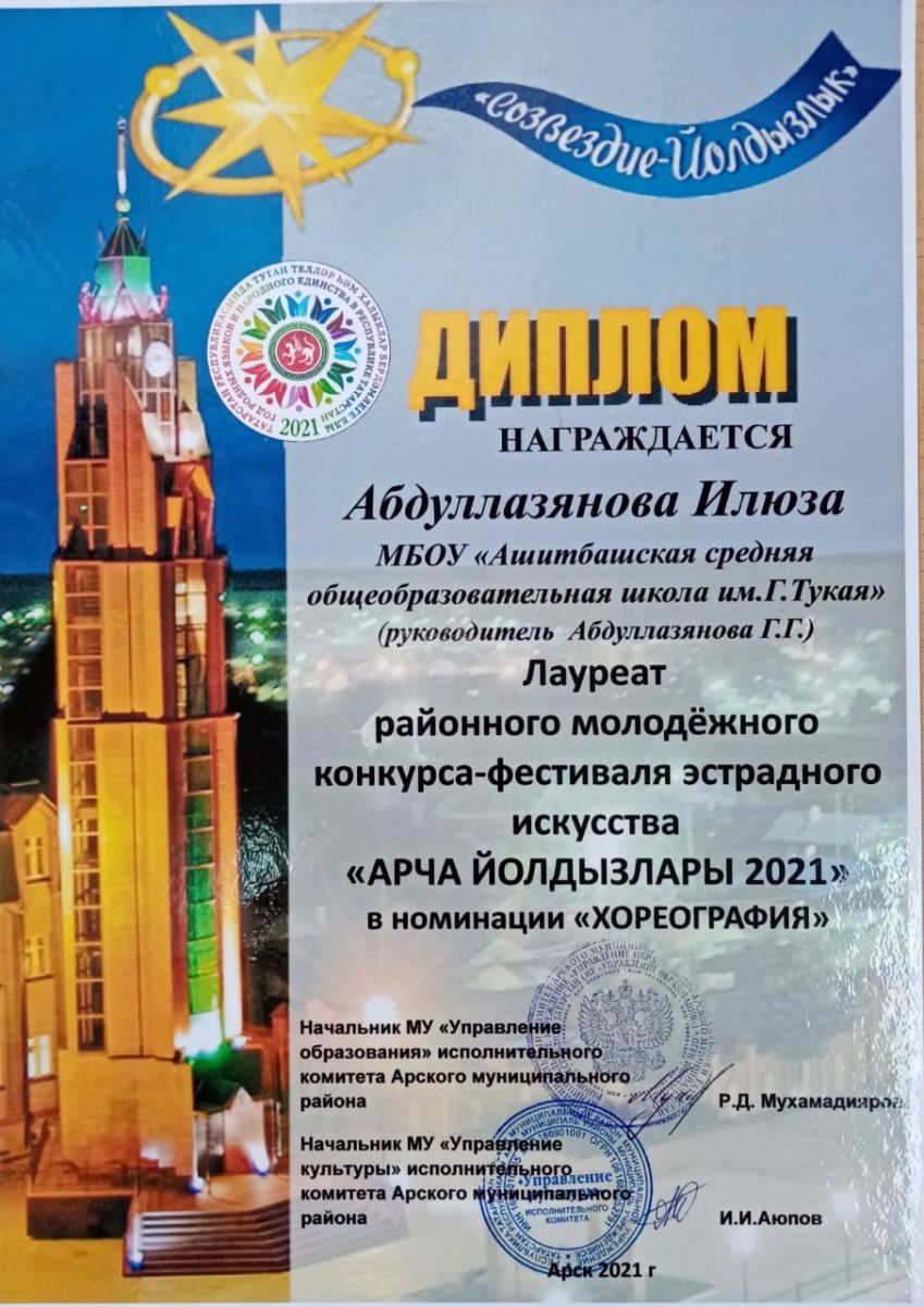 Диплом лауреата районного молодежного конкурса-фестиваля эстрадного искусства "Арча Йолдызлары 2021"