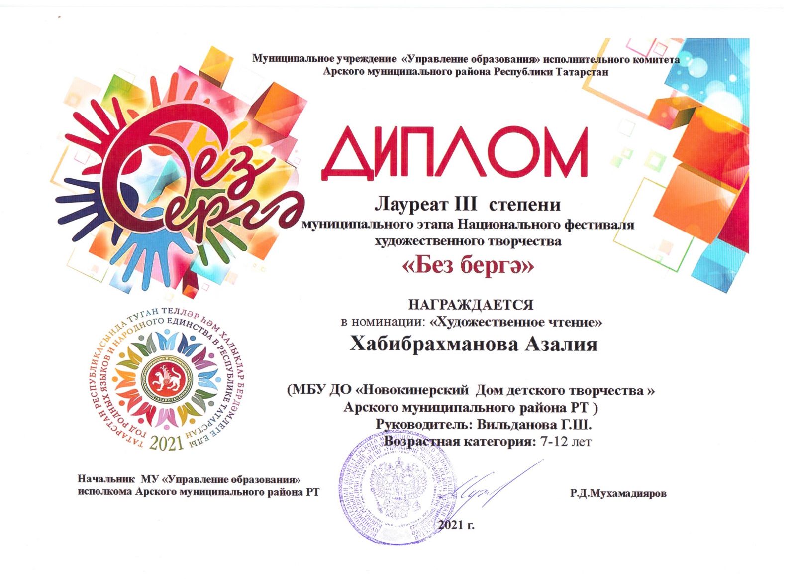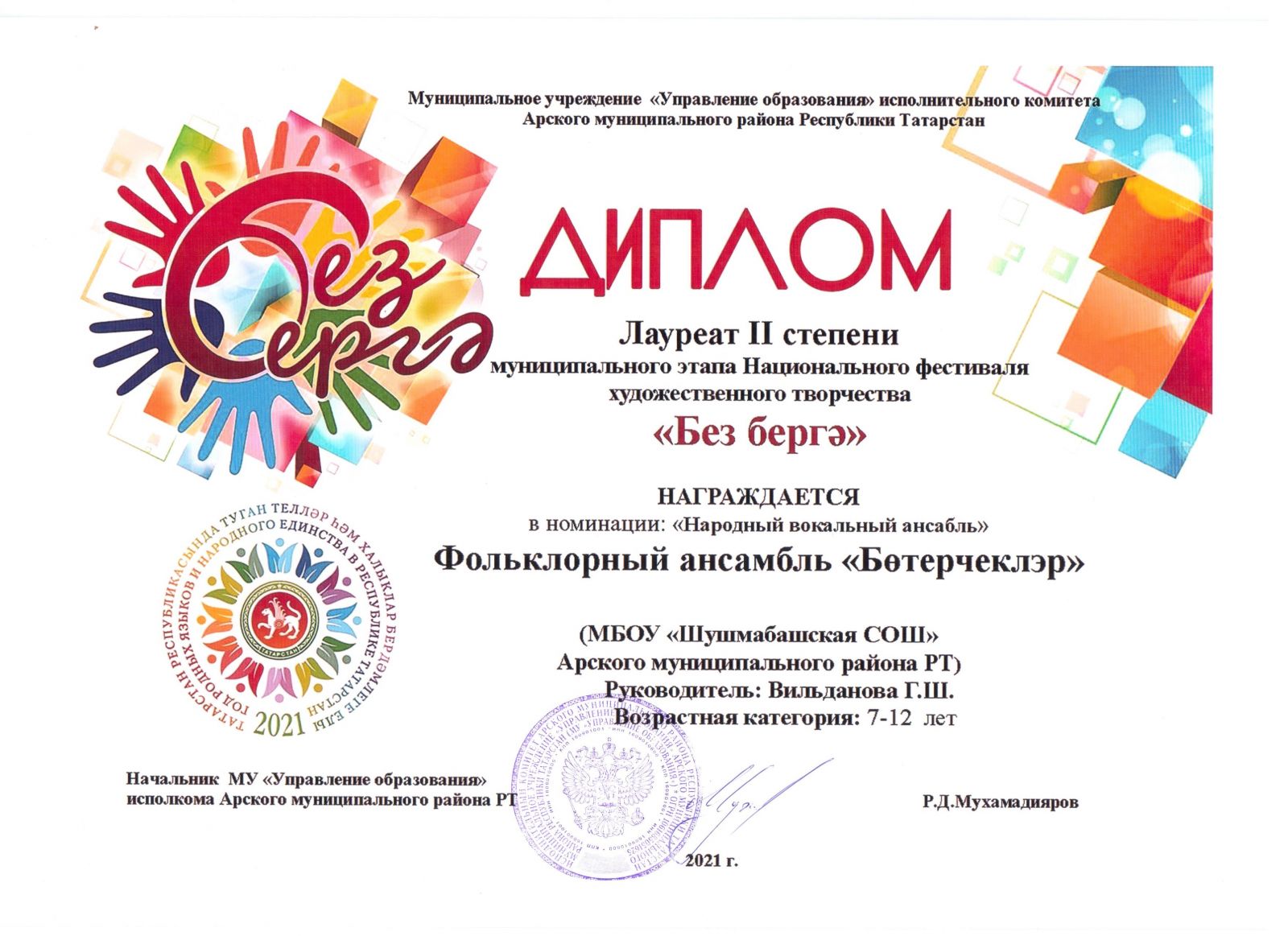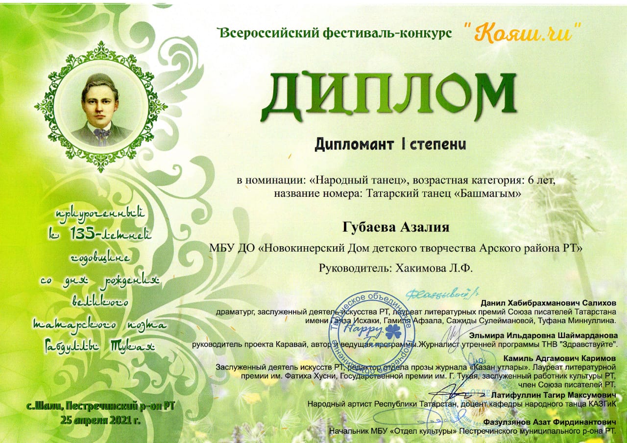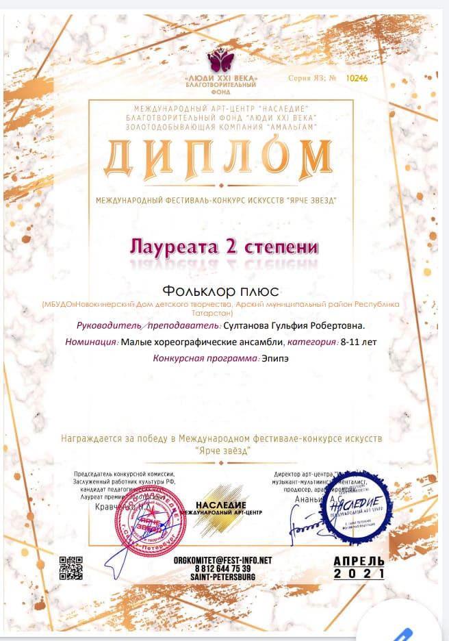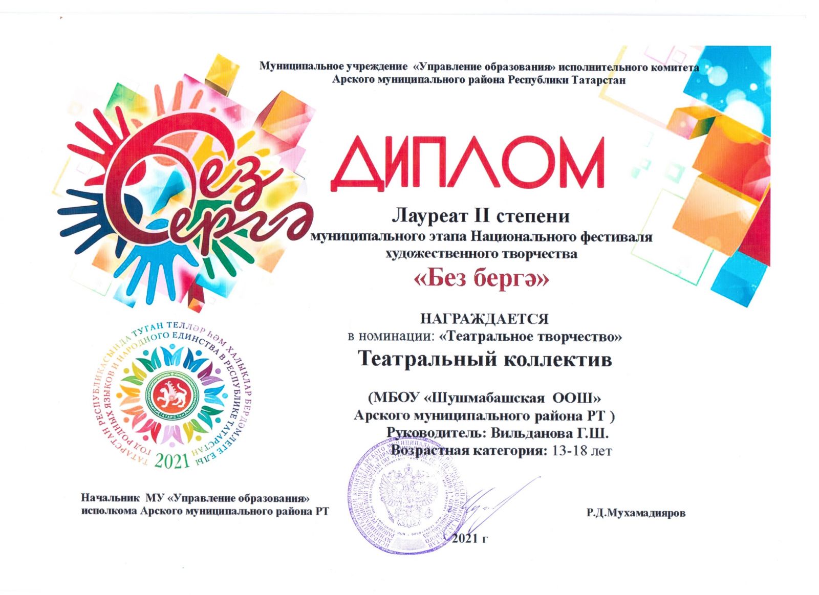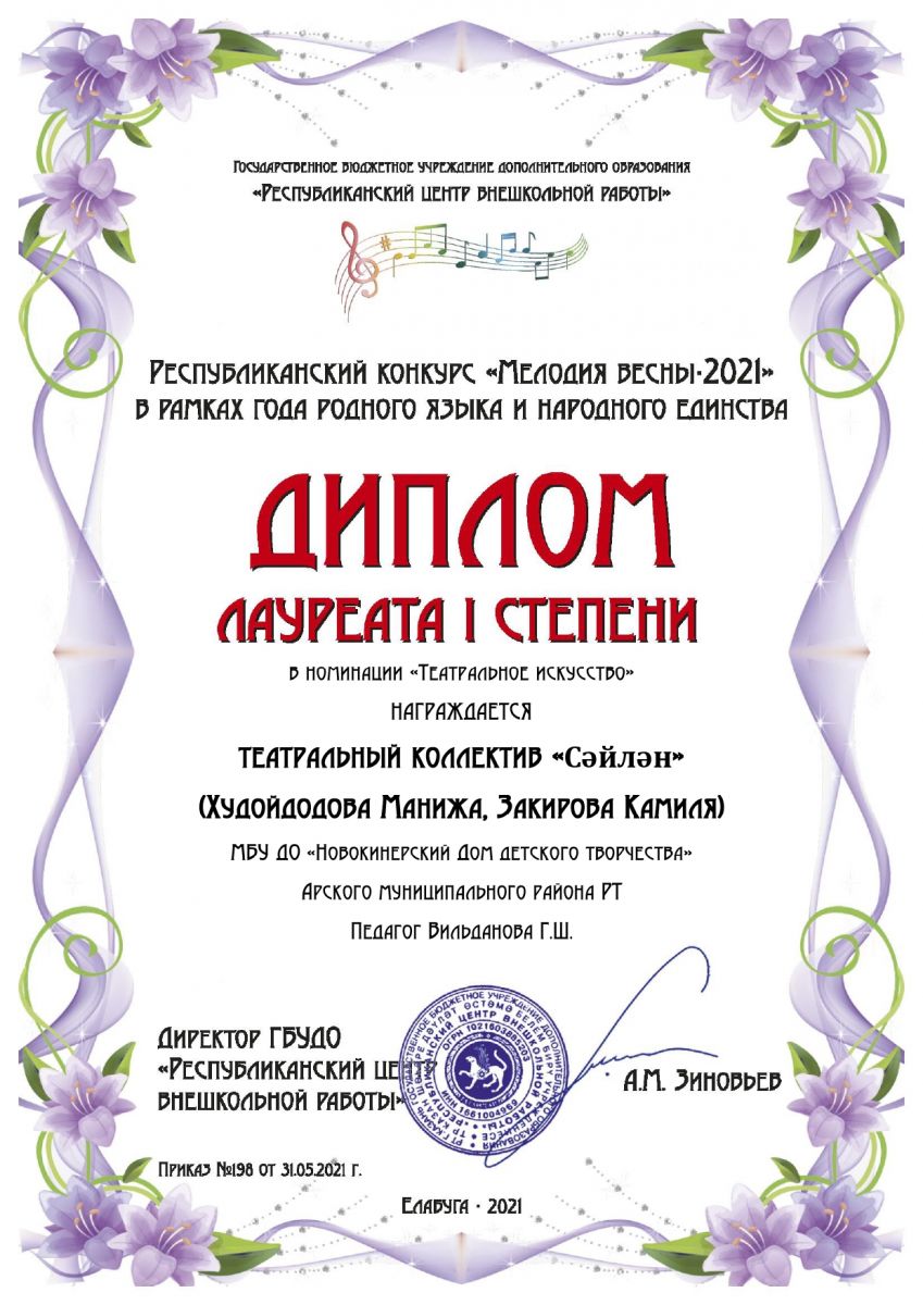 Диплом лауреата районного молодежного конкурса-фестиваля эстрадного искусства "Арча Йолдызлары 2021"