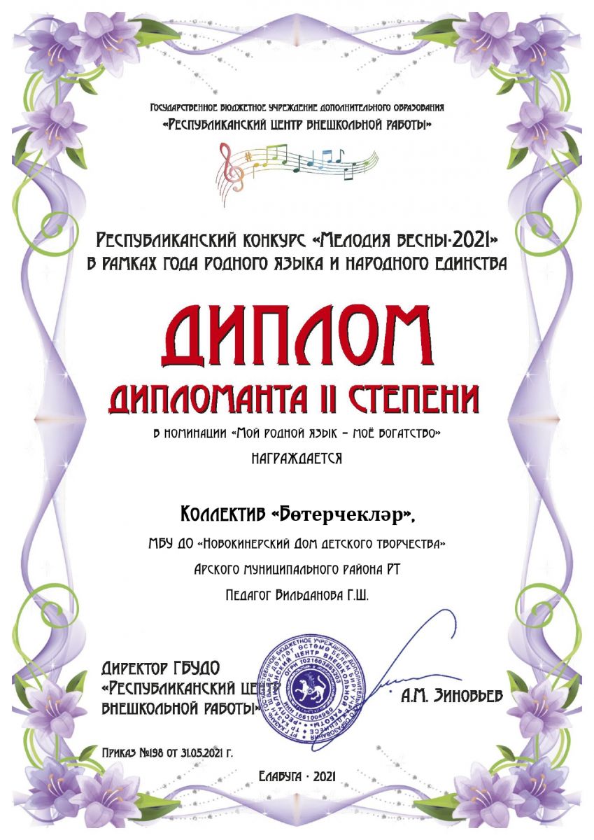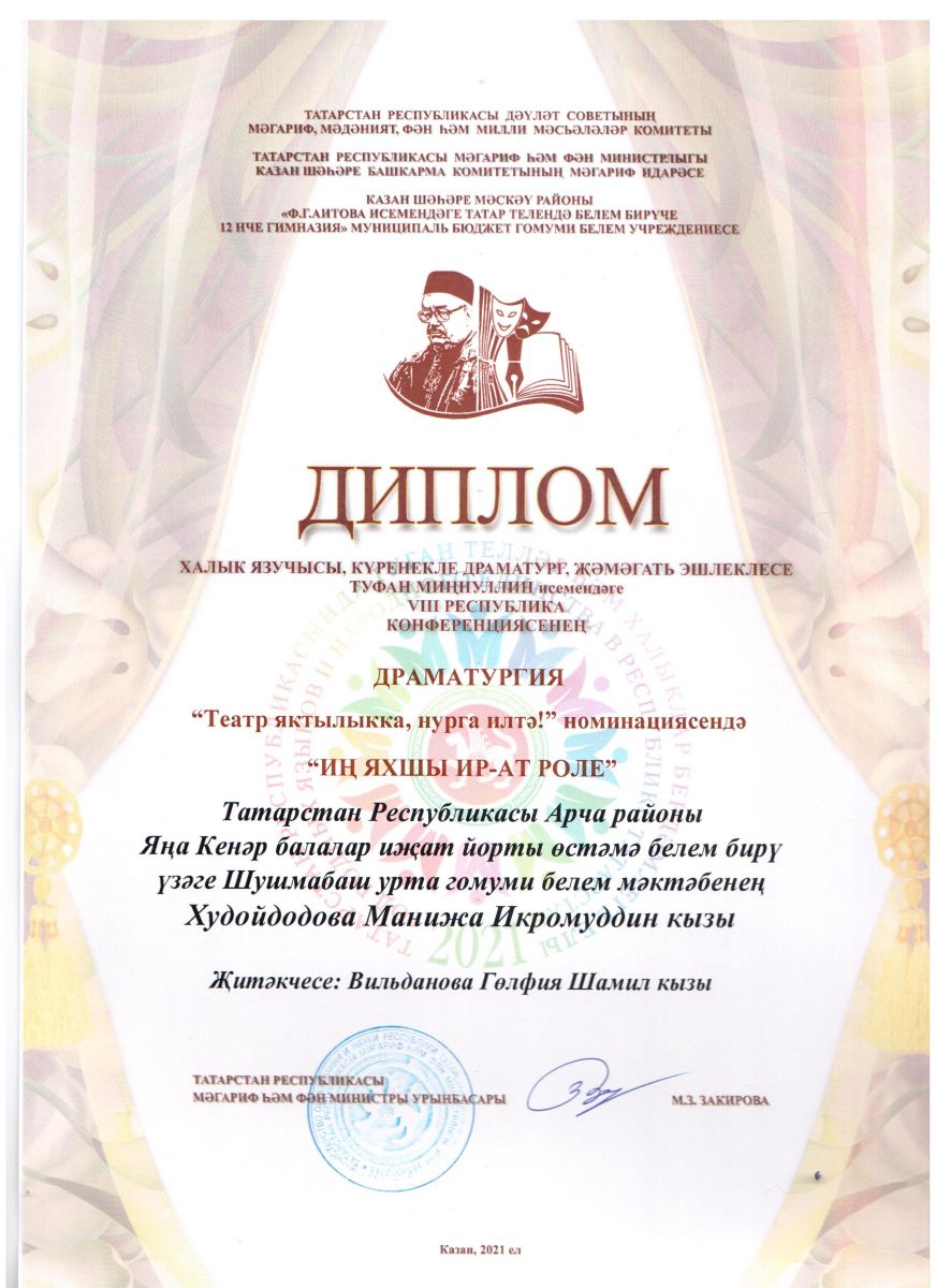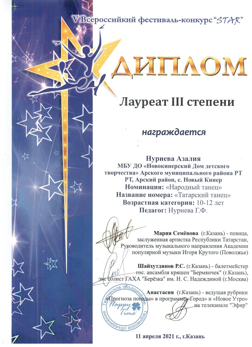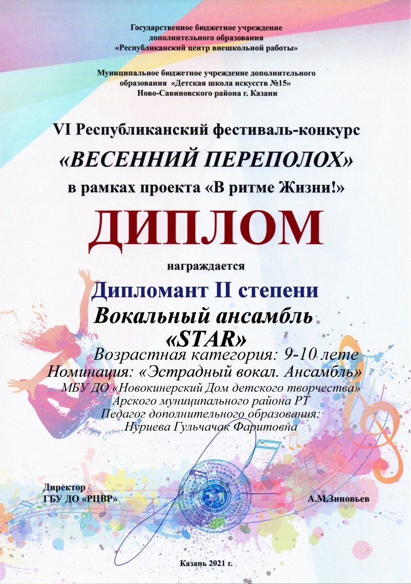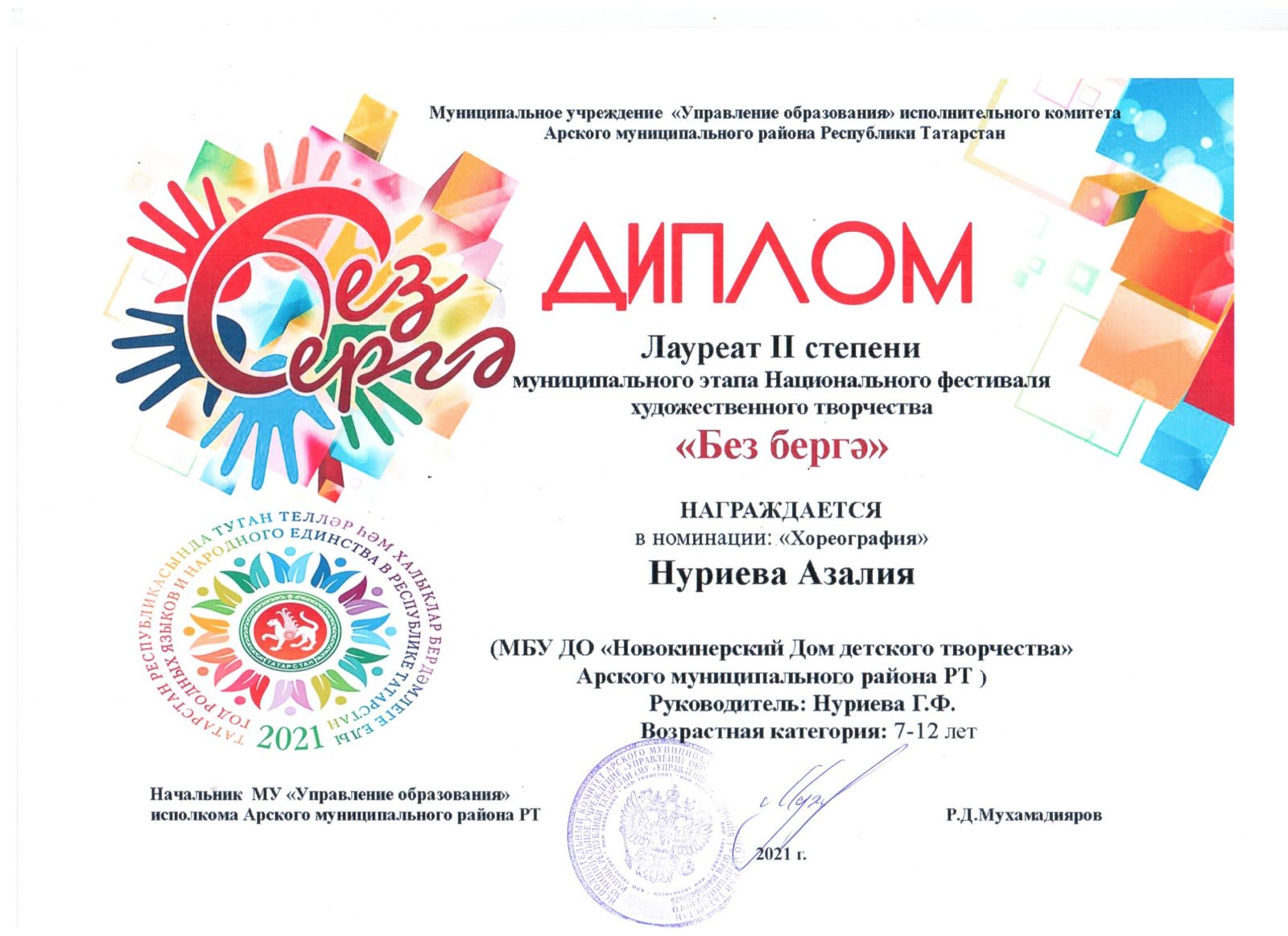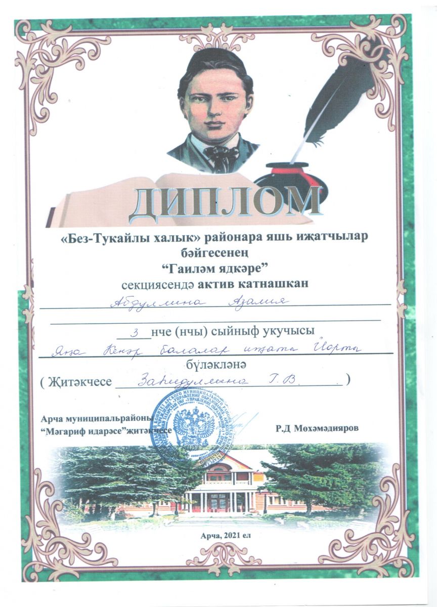 Диплом лауреата районного молодежного конкурса-фестиваля эстрадного искусства "Арча Йолдызлары 2021"