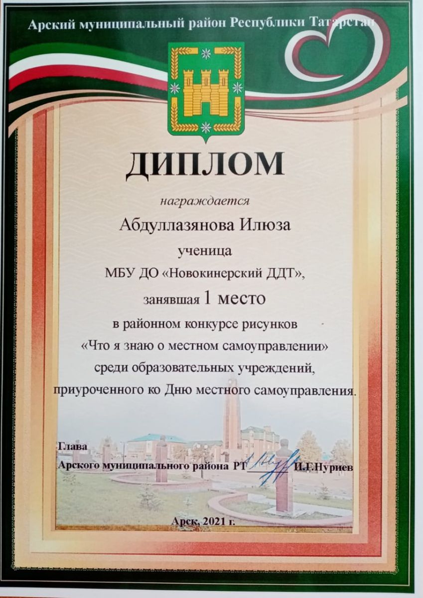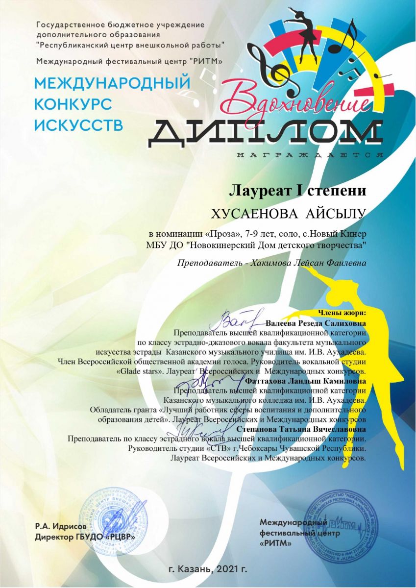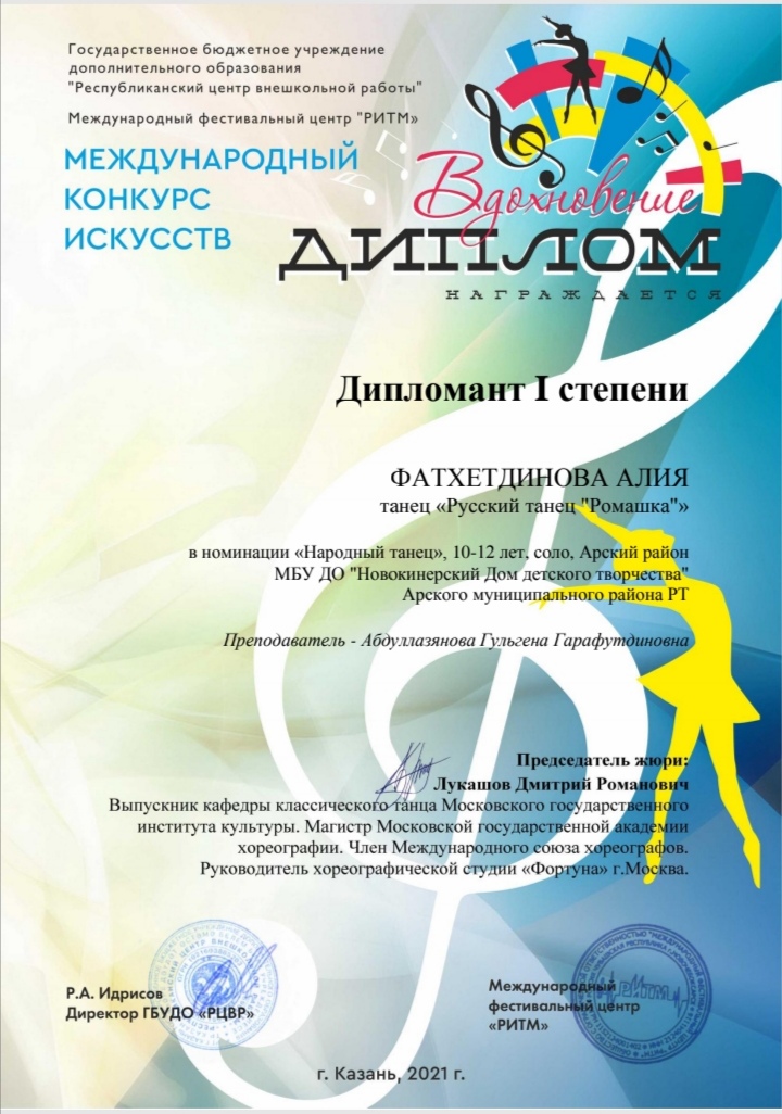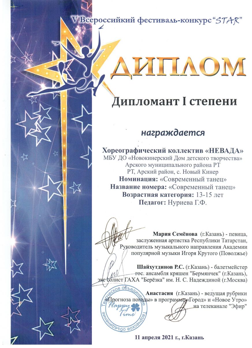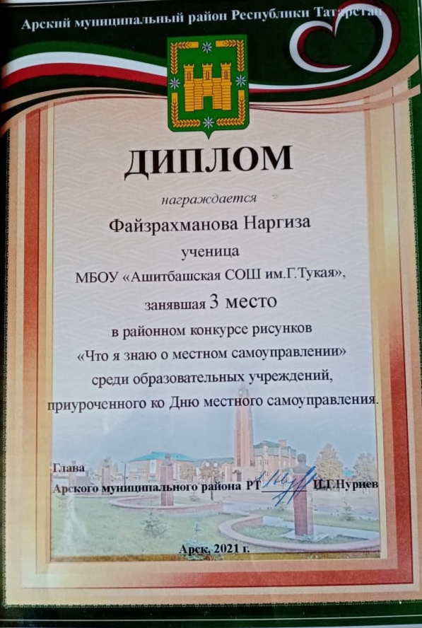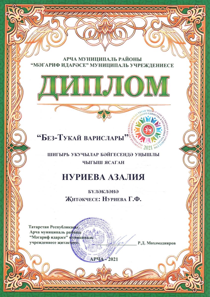 Диплом лауреата районного молодежного конкурса-фестиваля эстрадного искусства "Арча Йолдызлары 2021"