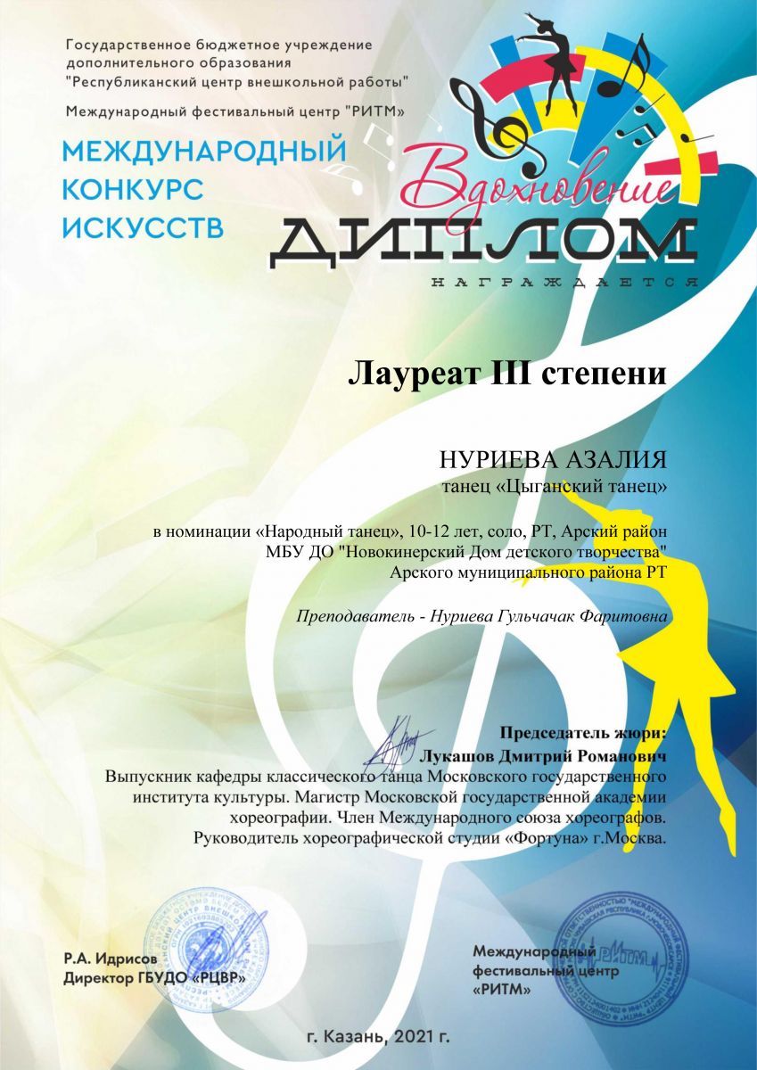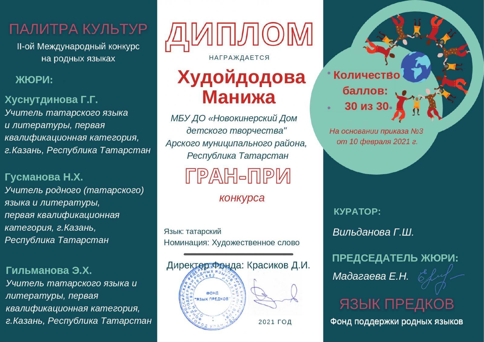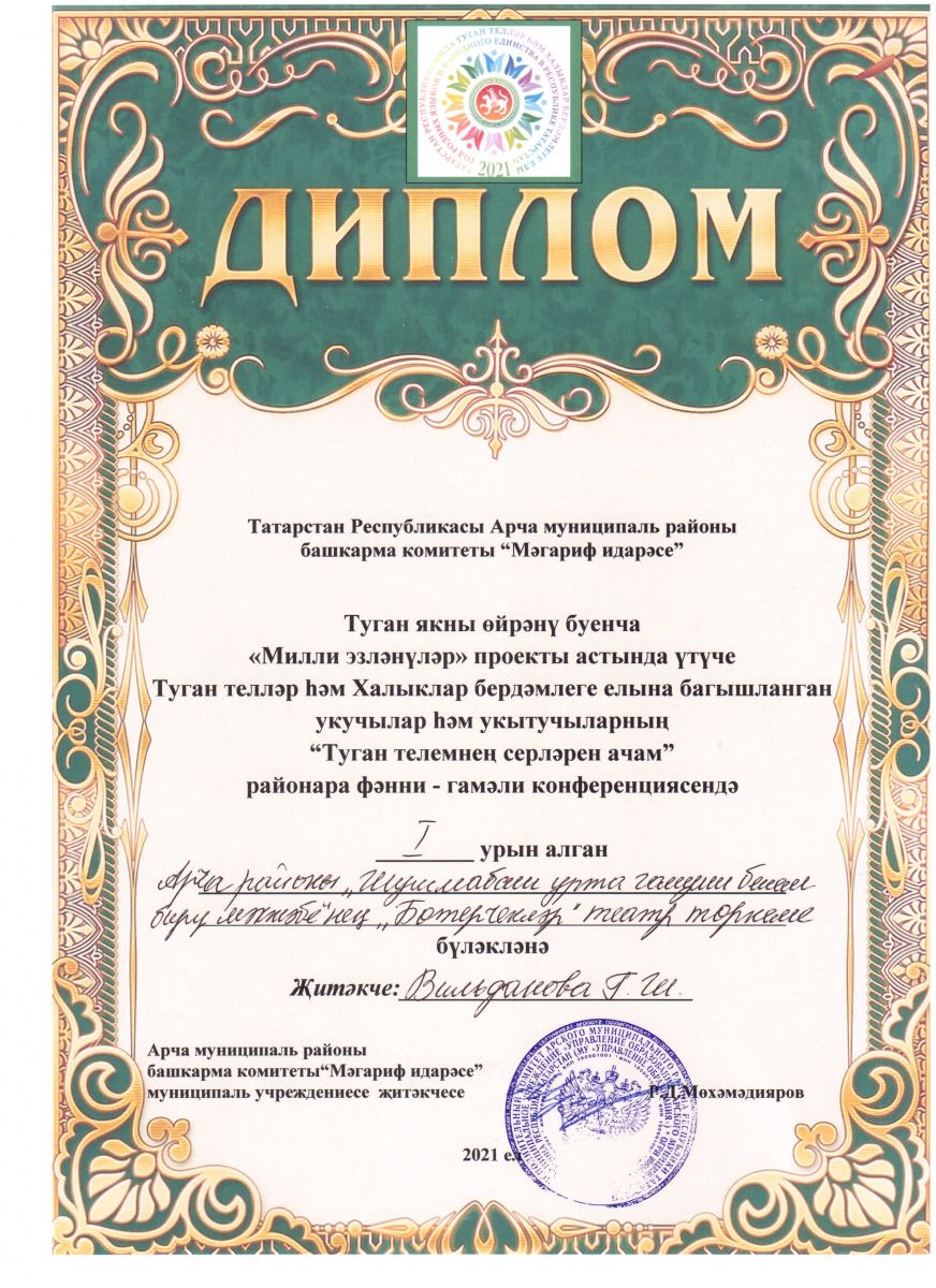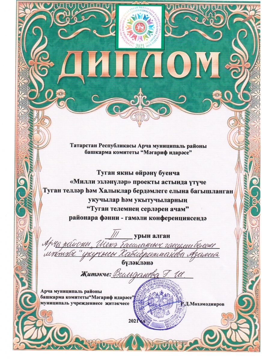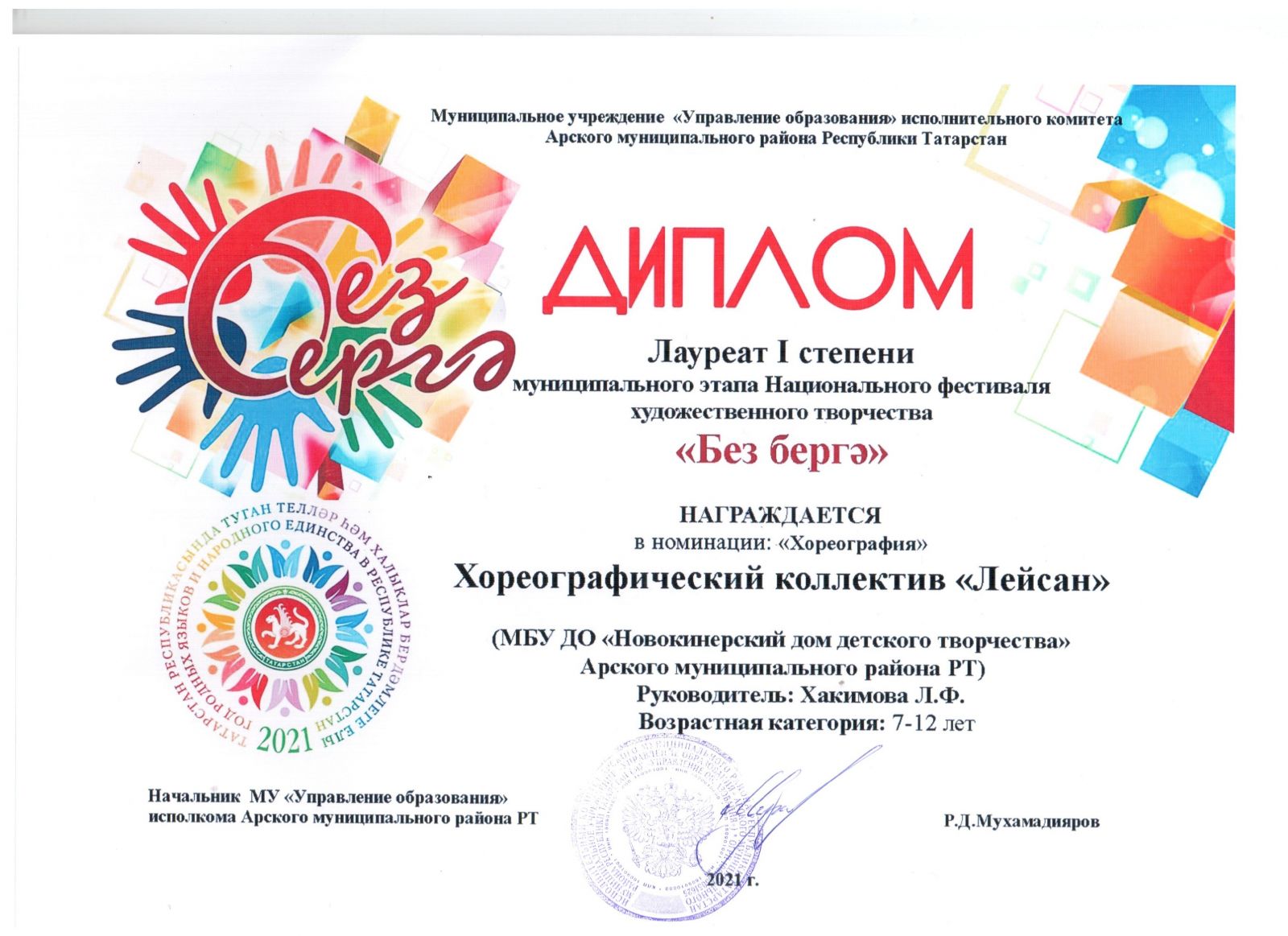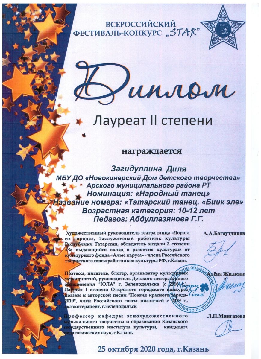 Диплом лауреата районного молодежного конкурса-фестиваля эстрадного искусства "Арча Йолдызлары 2021"