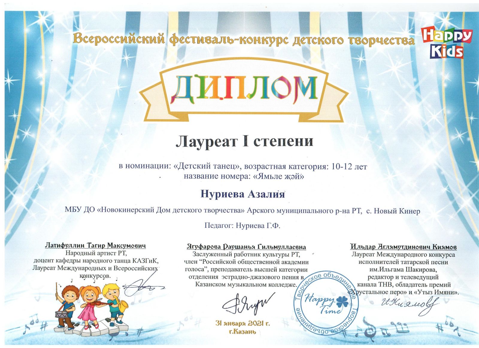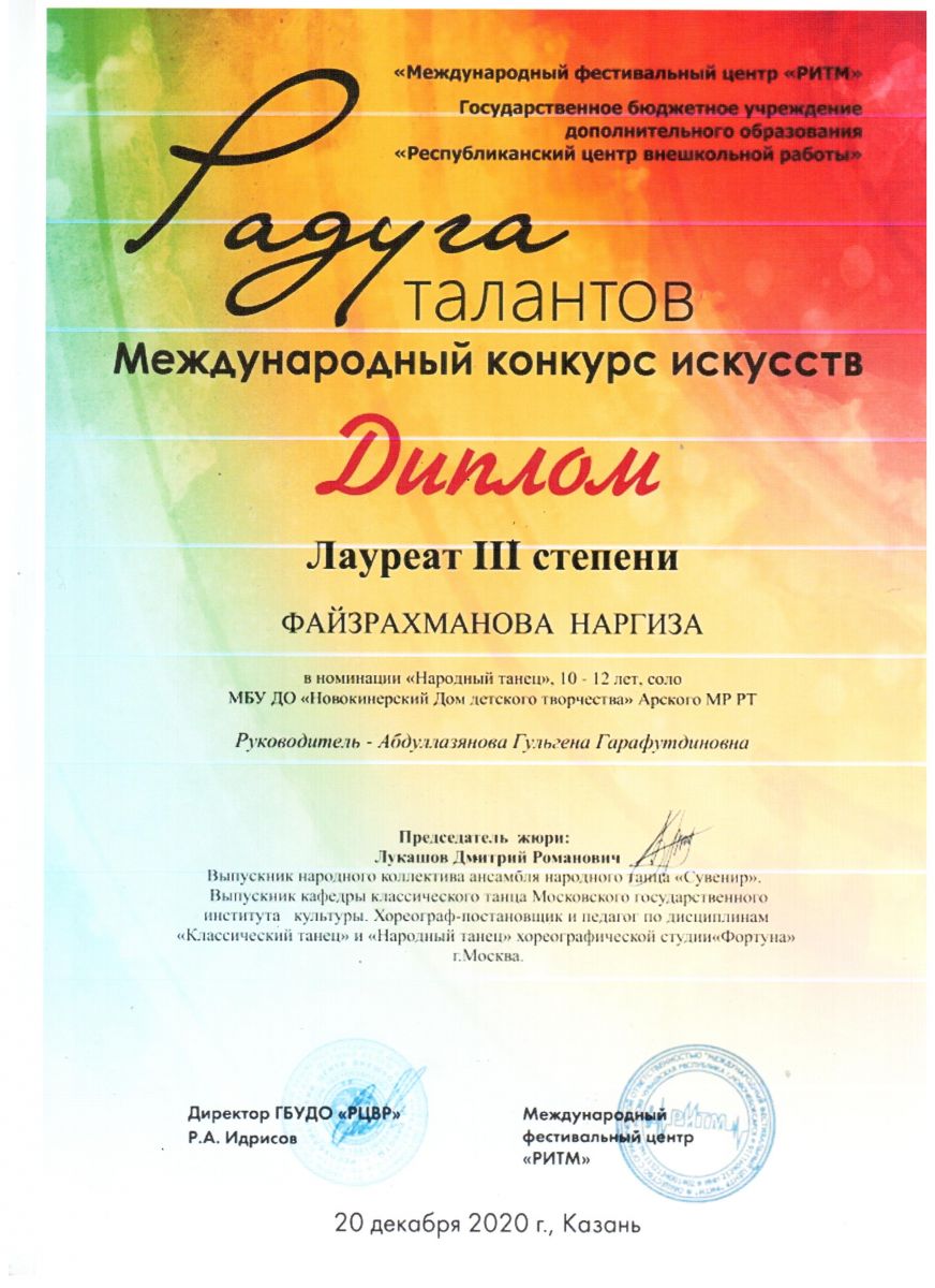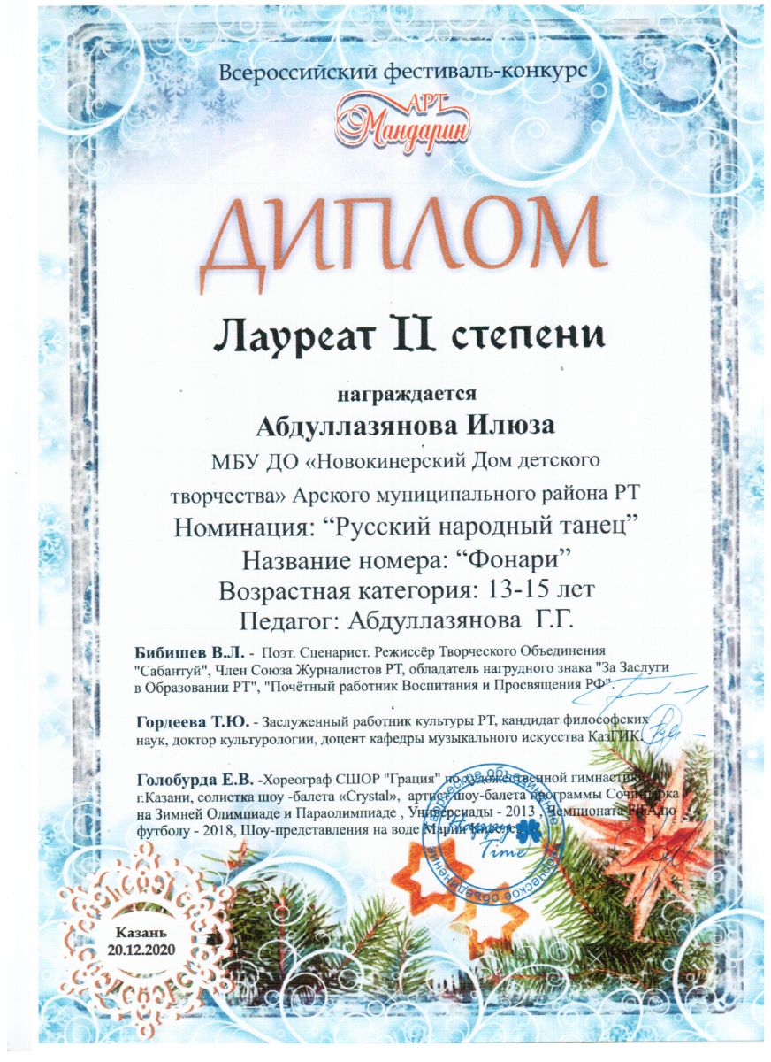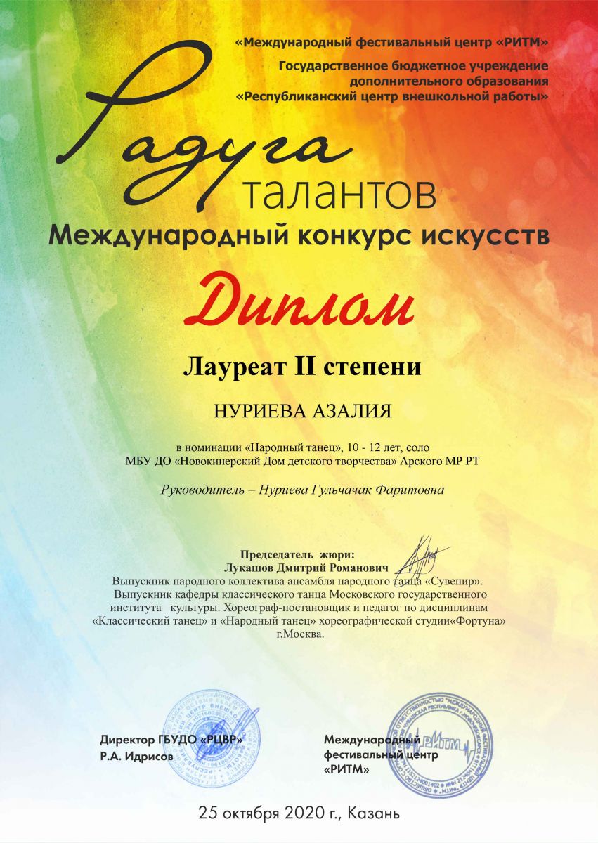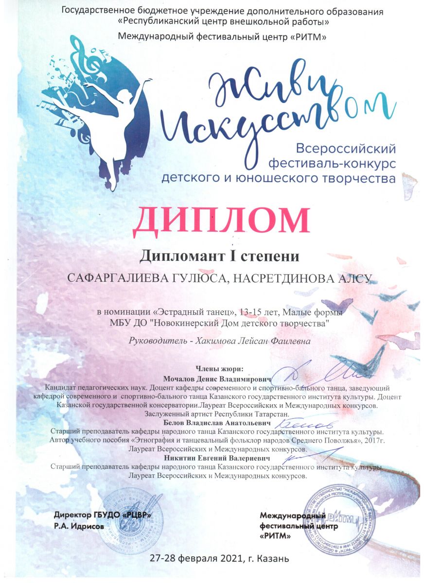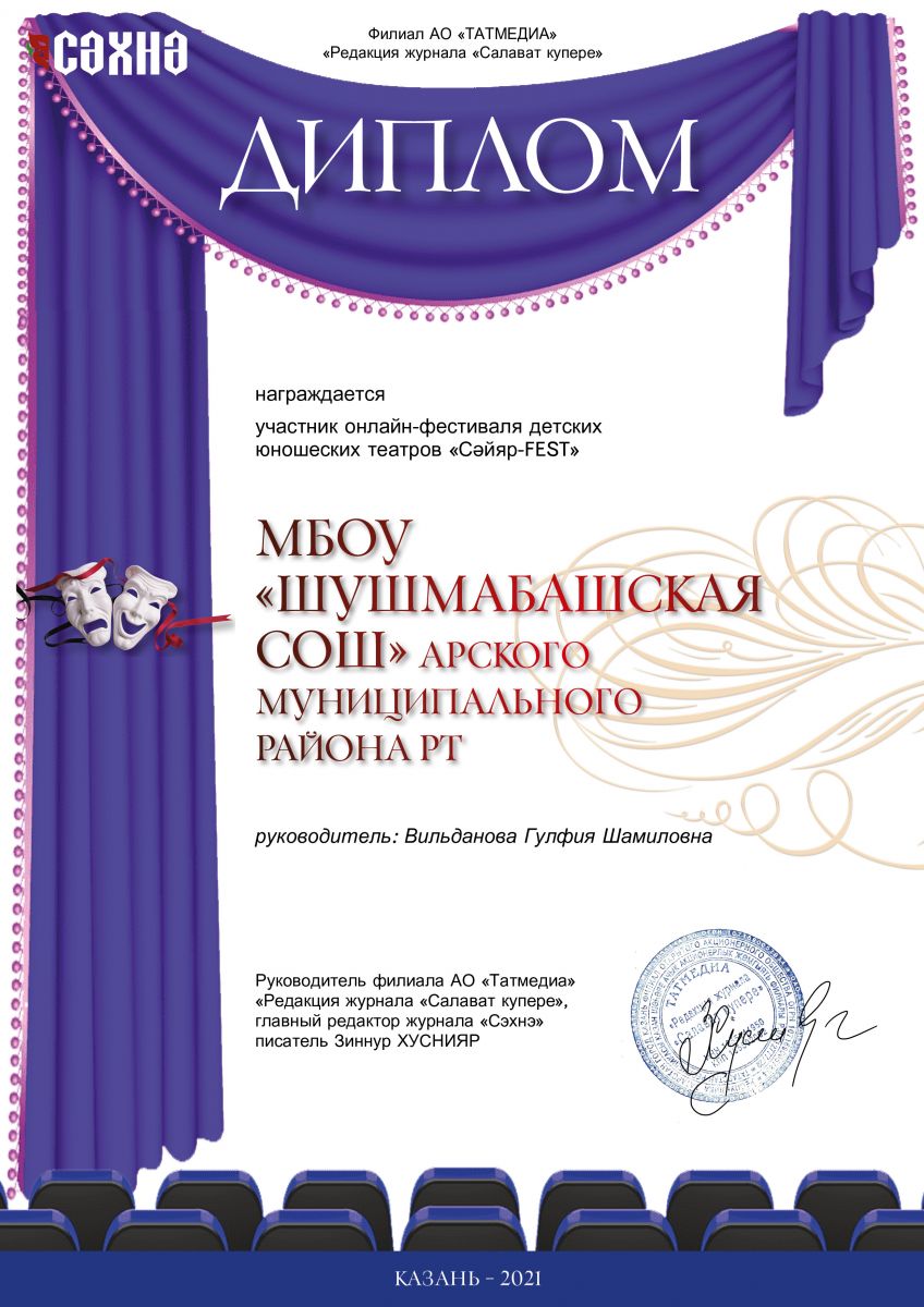 Диплом лауреата районного молодежного конкурса-фестиваля эстрадного искусства "Арча Йолдызлары 2021"