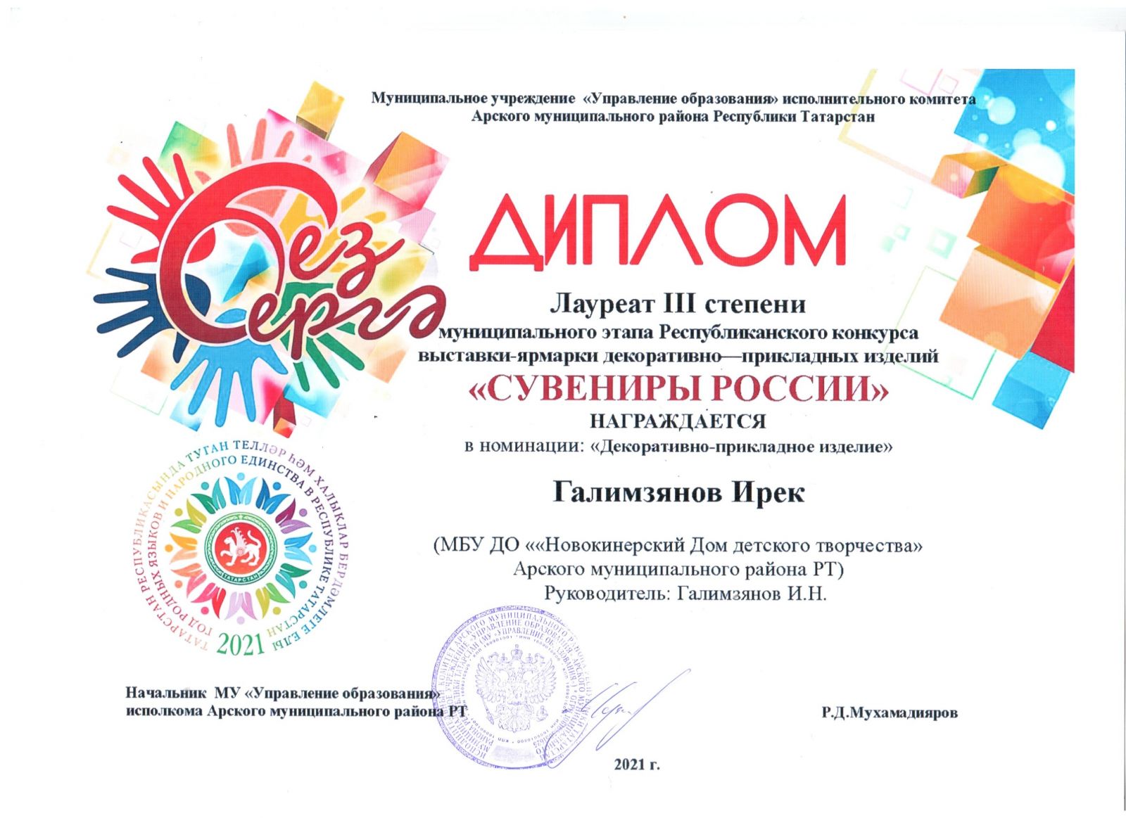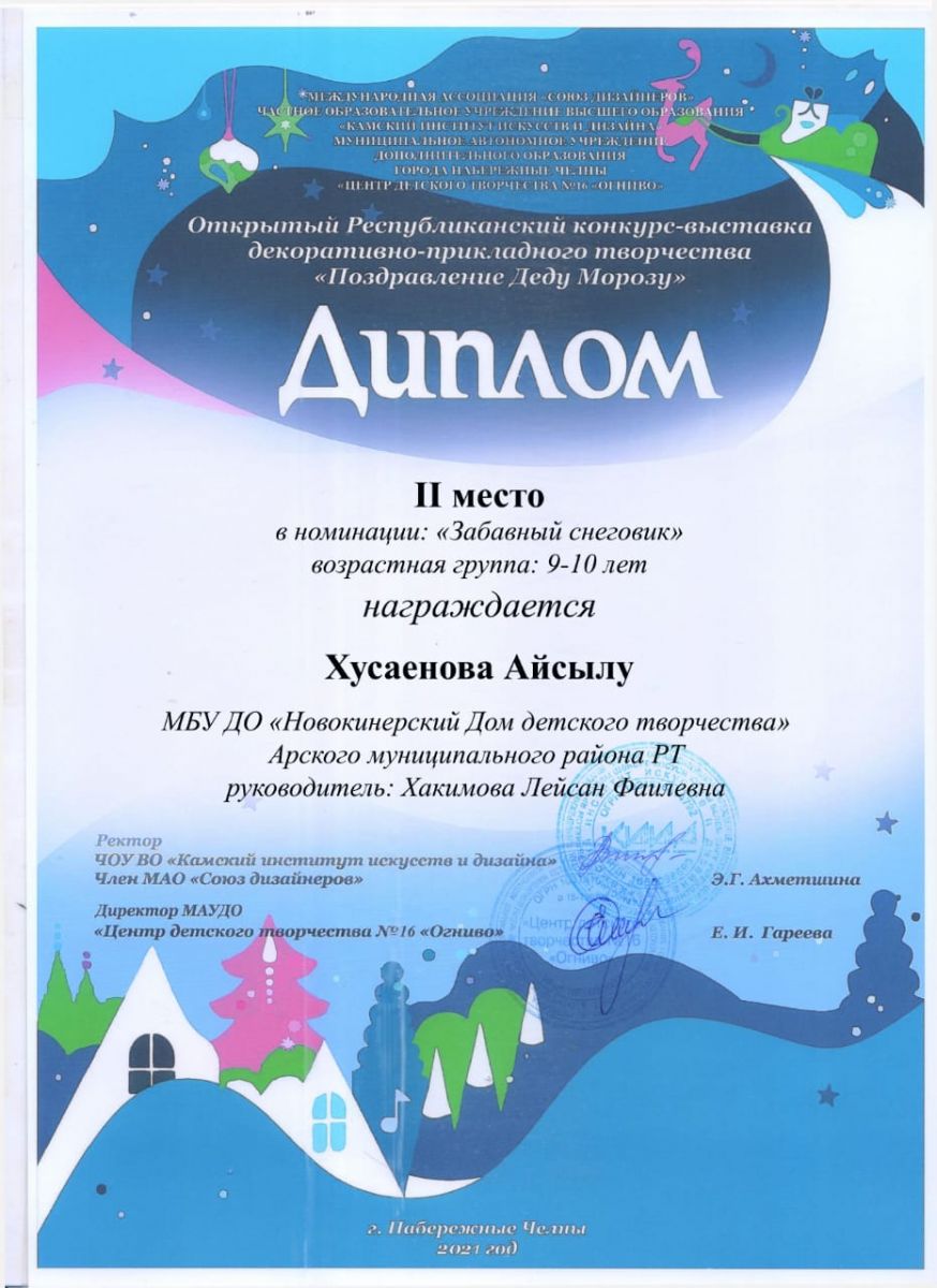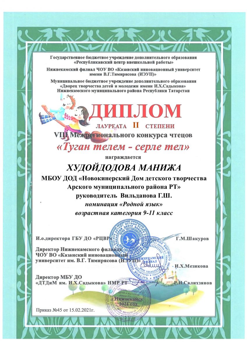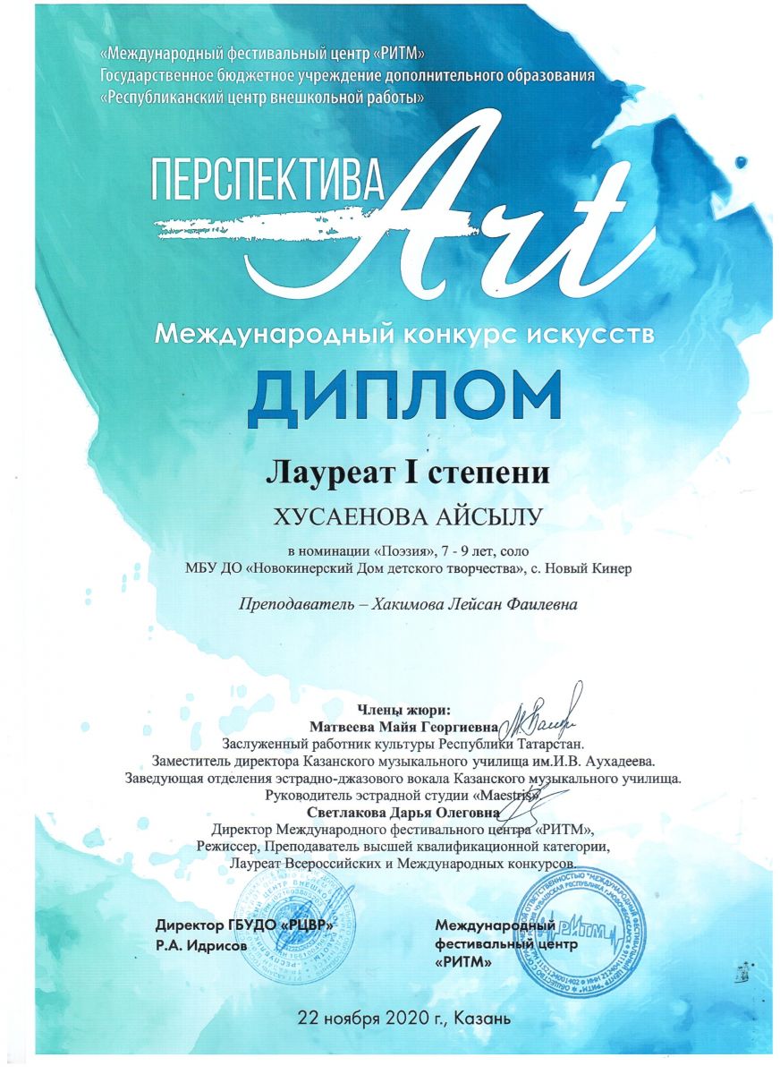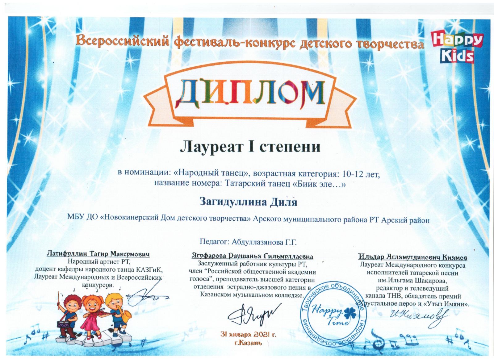 Диплом лауреата районного молодежного конкурса-фестиваля эстрадного искусства "Арча Йолдызлары 2021"