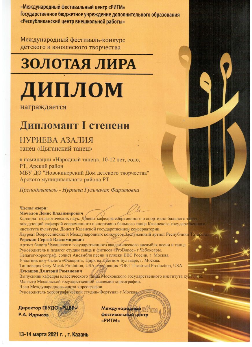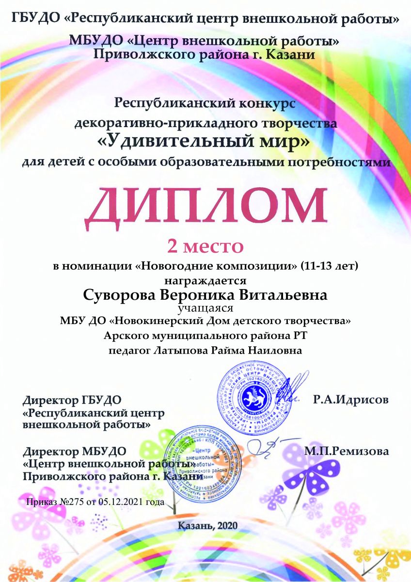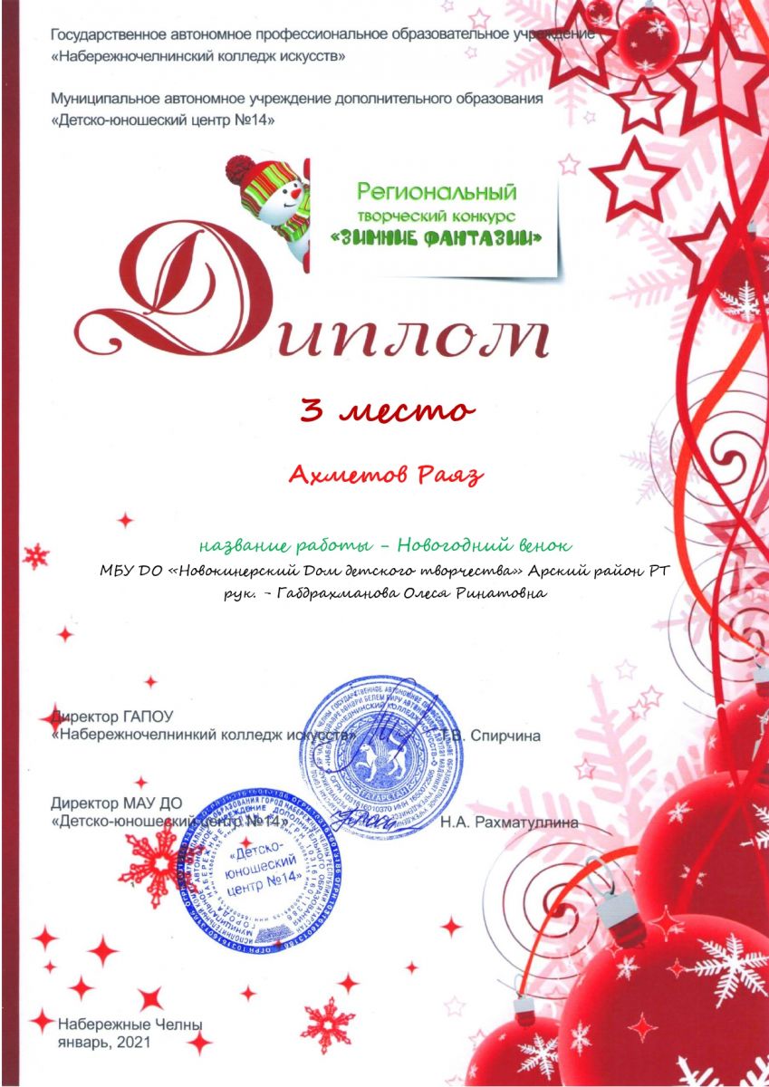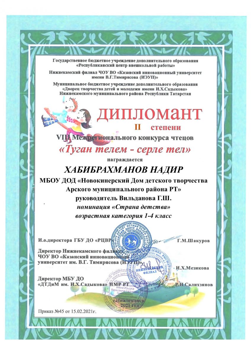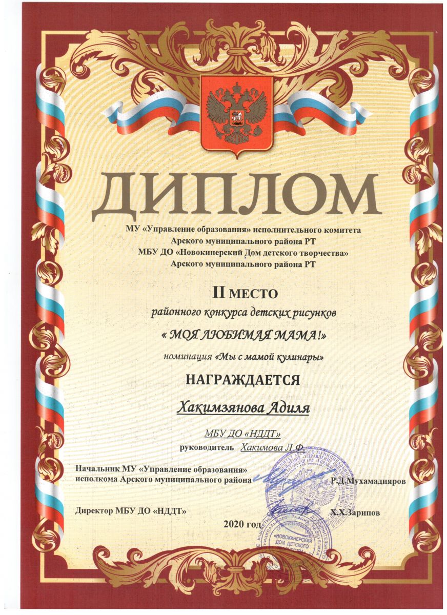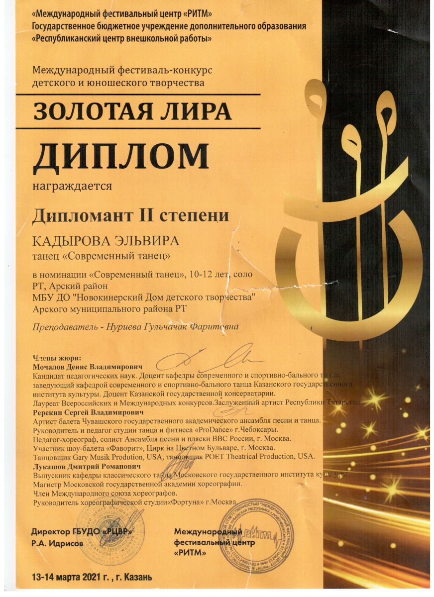 Диплом лауреата районного молодежного конкурса-фестиваля эстрадного искусства "Арча Йолдызлары 2021"