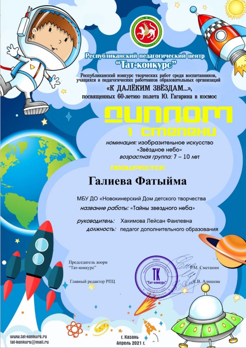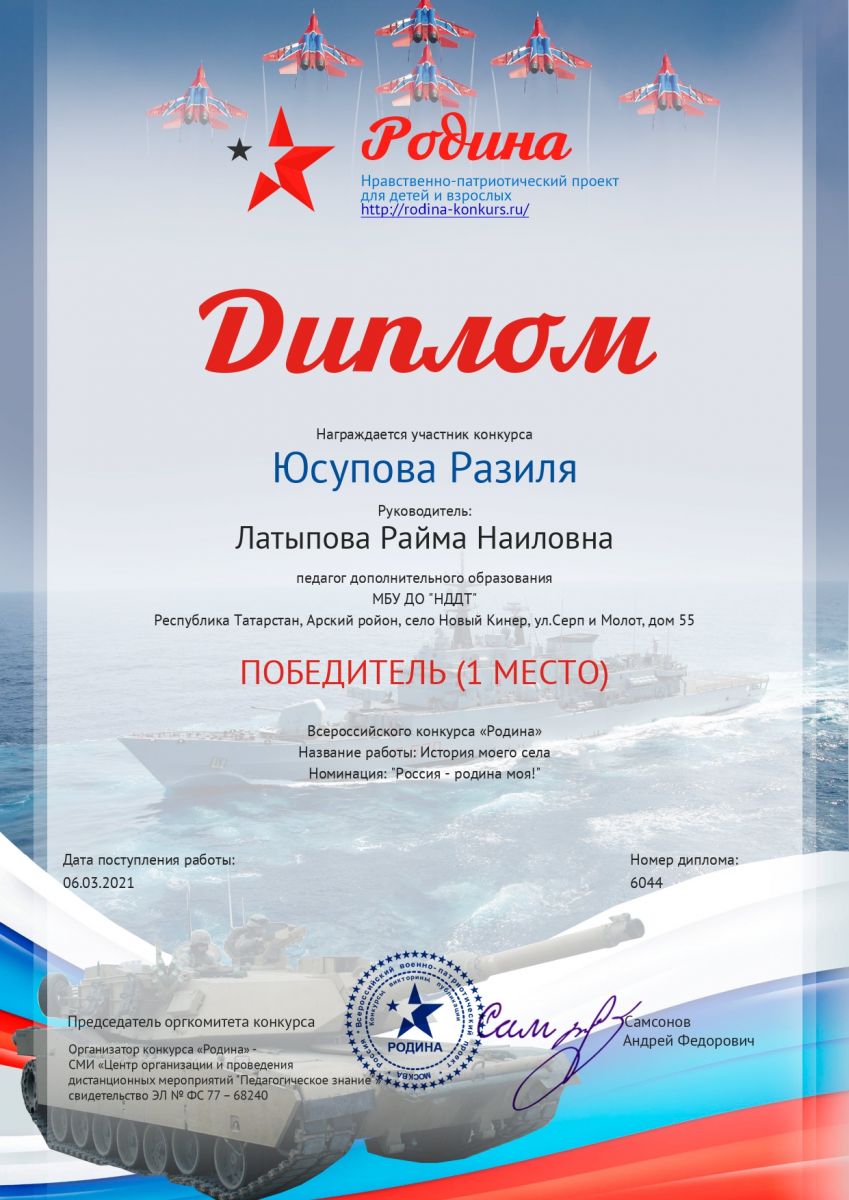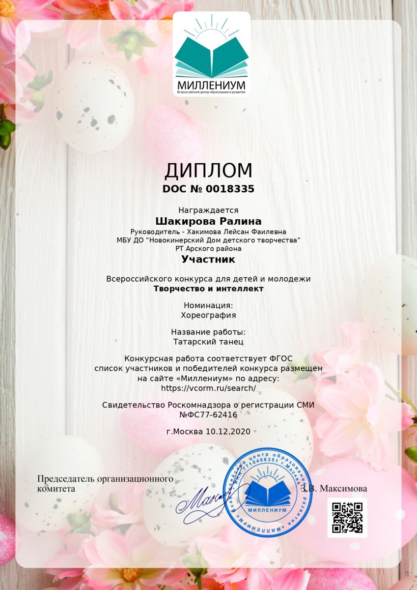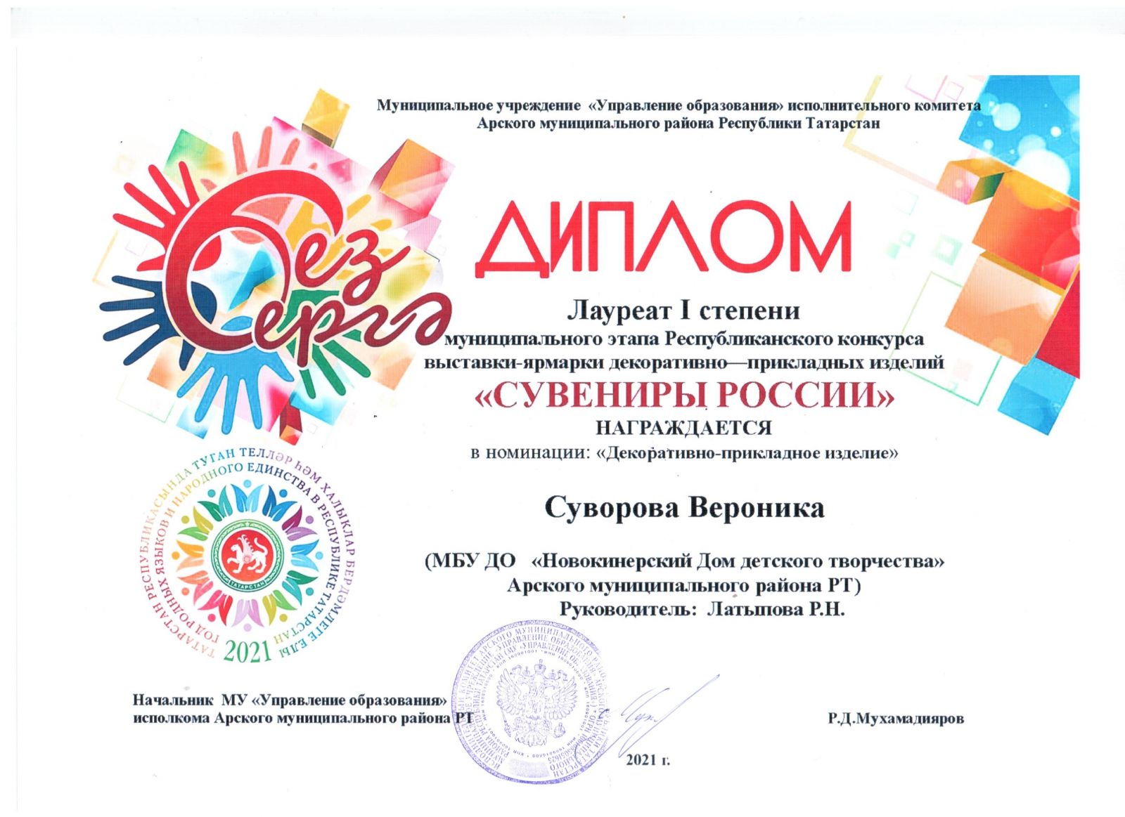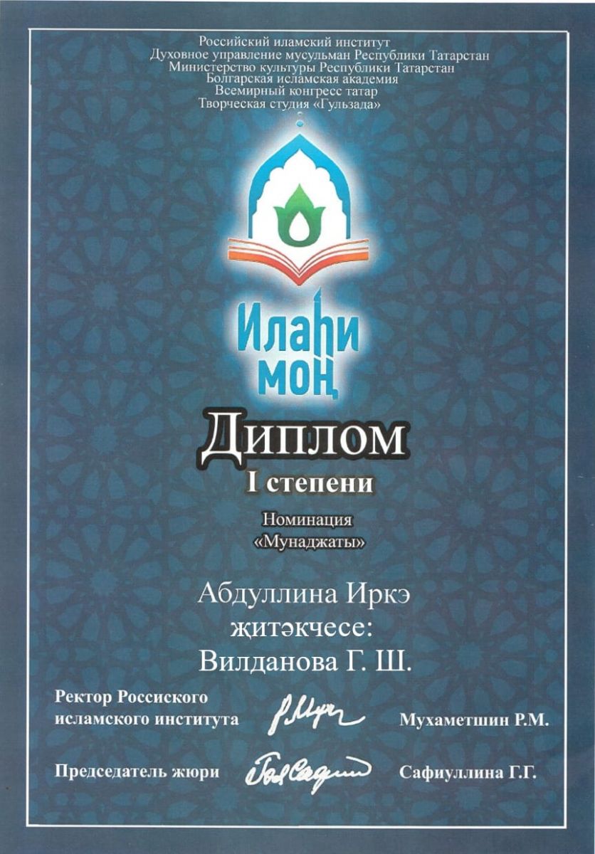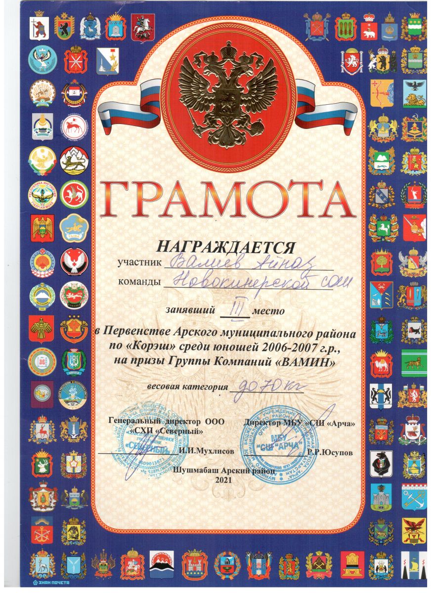Диплом лауреата районного молодежного конкурса-фестиваля эстрадного искусства "Арча Йолдызлары 2021"