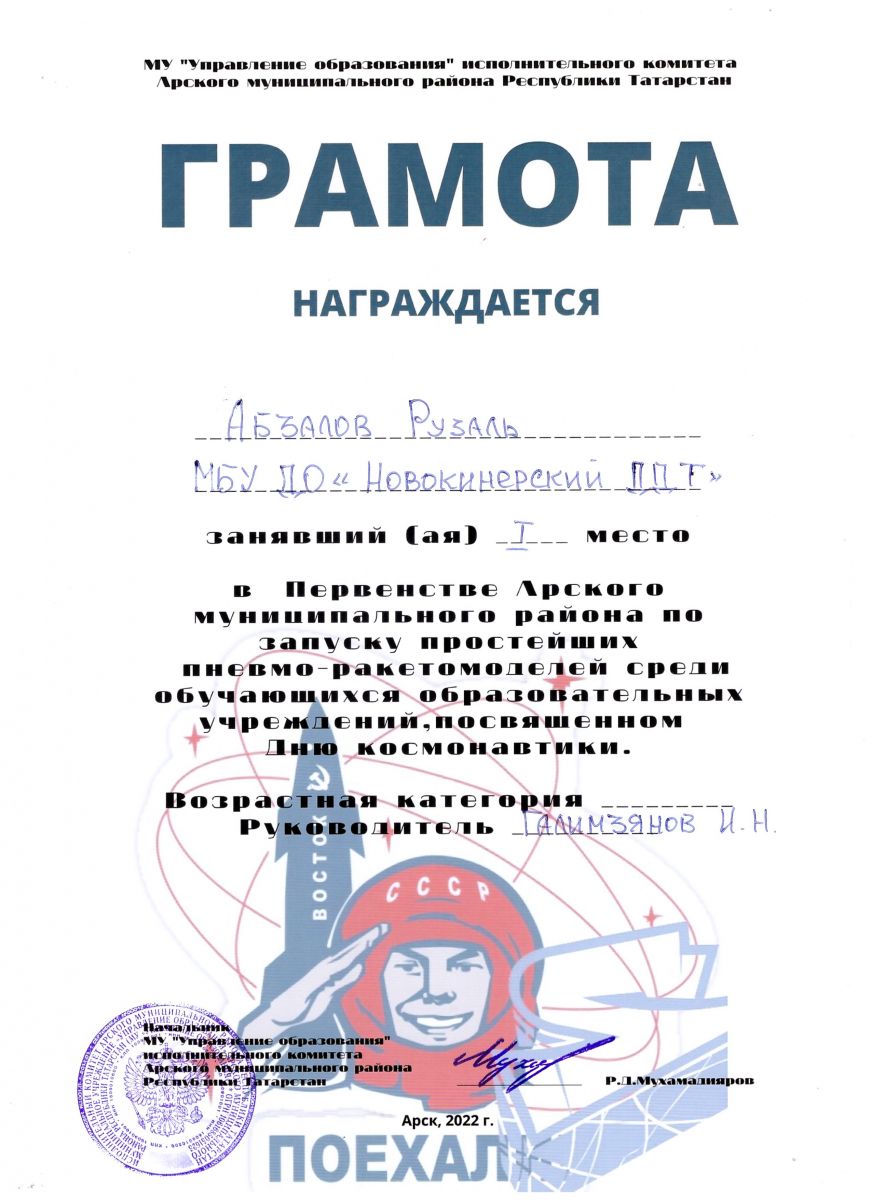1 место в Первенстве по запуску простейших пневмо-ракетомоделей