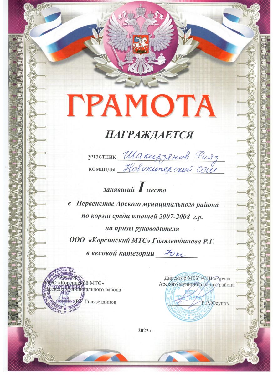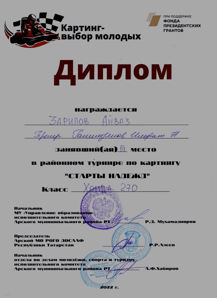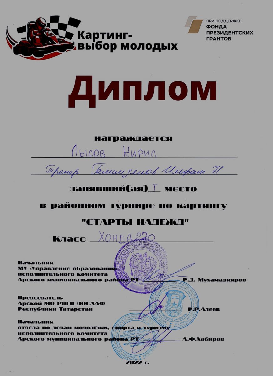Диплом 1 место - турнир по картингу "Старты надежд"