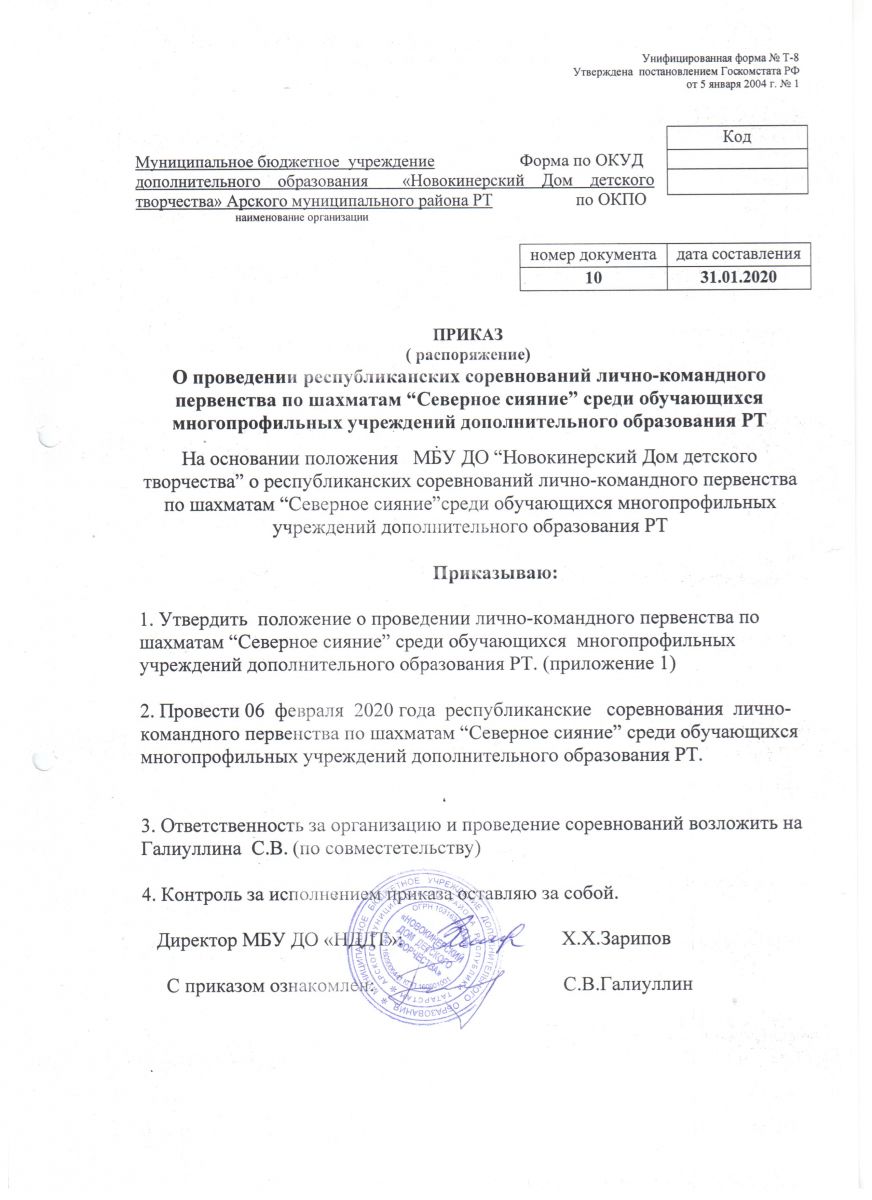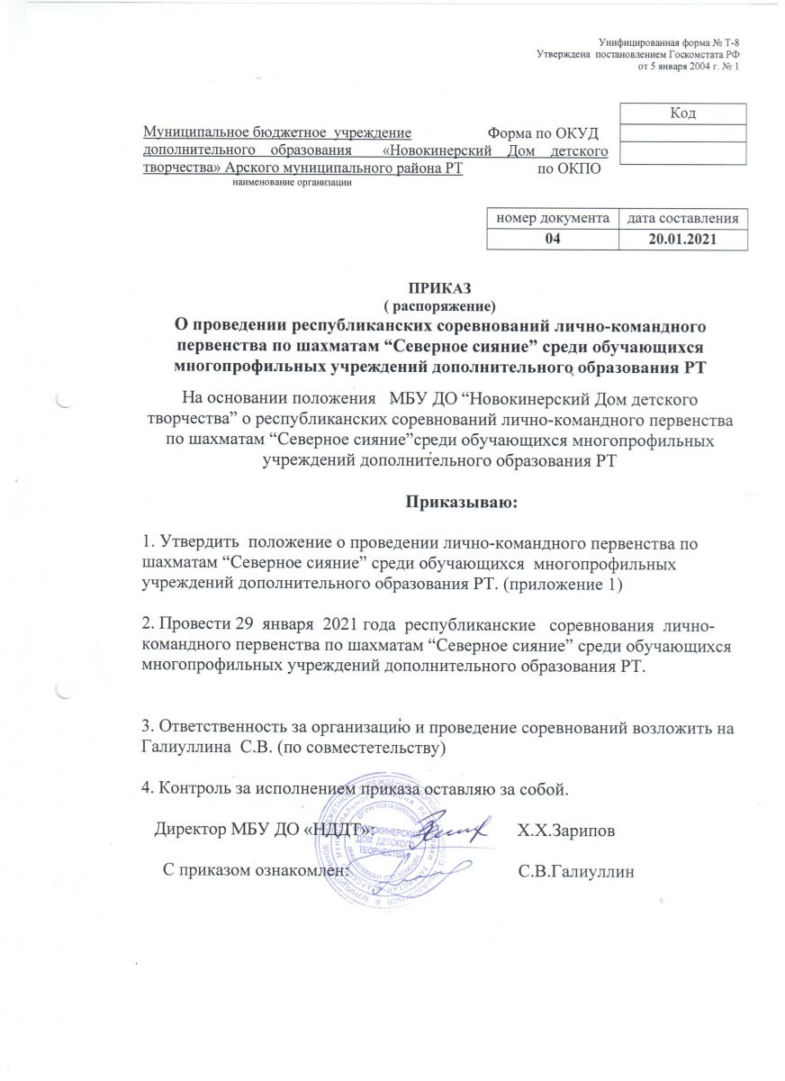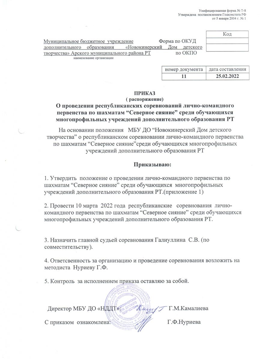Приказ о проведении республиканских соревнований по шахматам "Северное сияние"