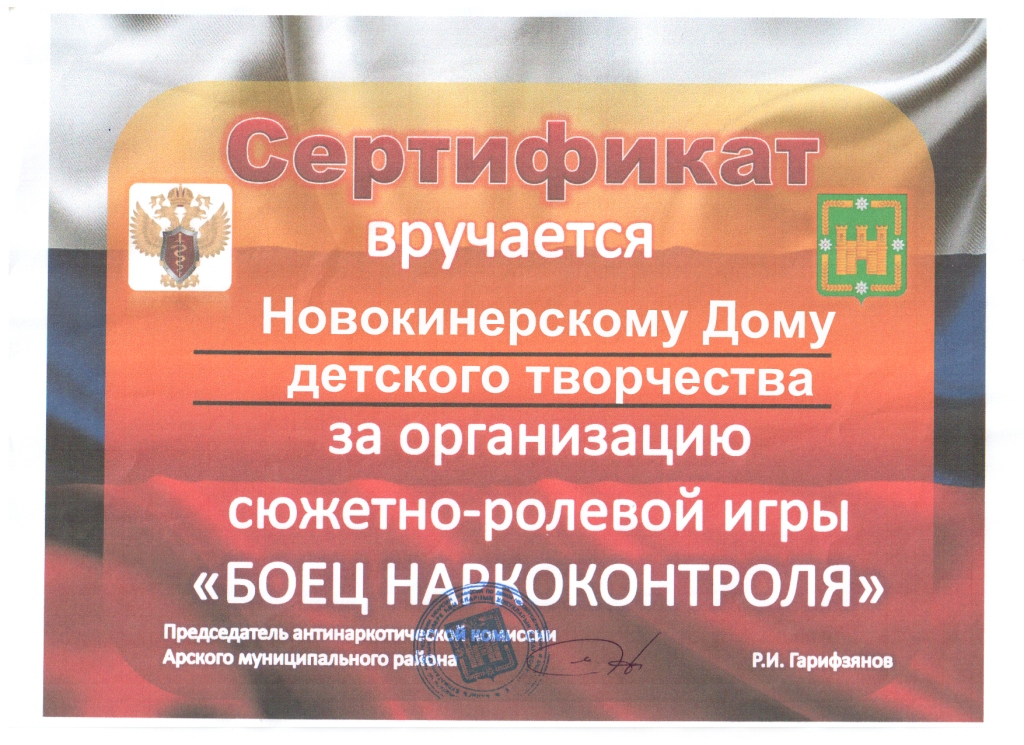 сертификат за организацию сюжетно ролевой игры "Боец наркаконтроля"