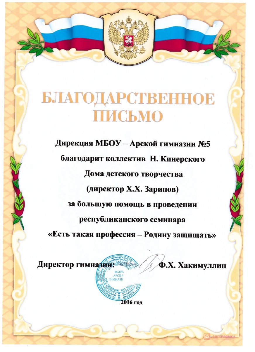 Благодарственное письмо за организацию республиканского семинара