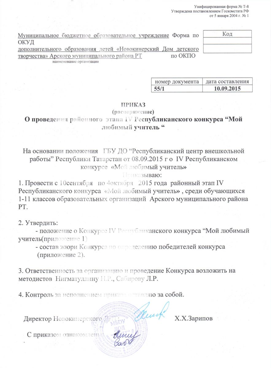 приказ о проведении районного этапа републиканского конкурса "Мой любимый учитель"