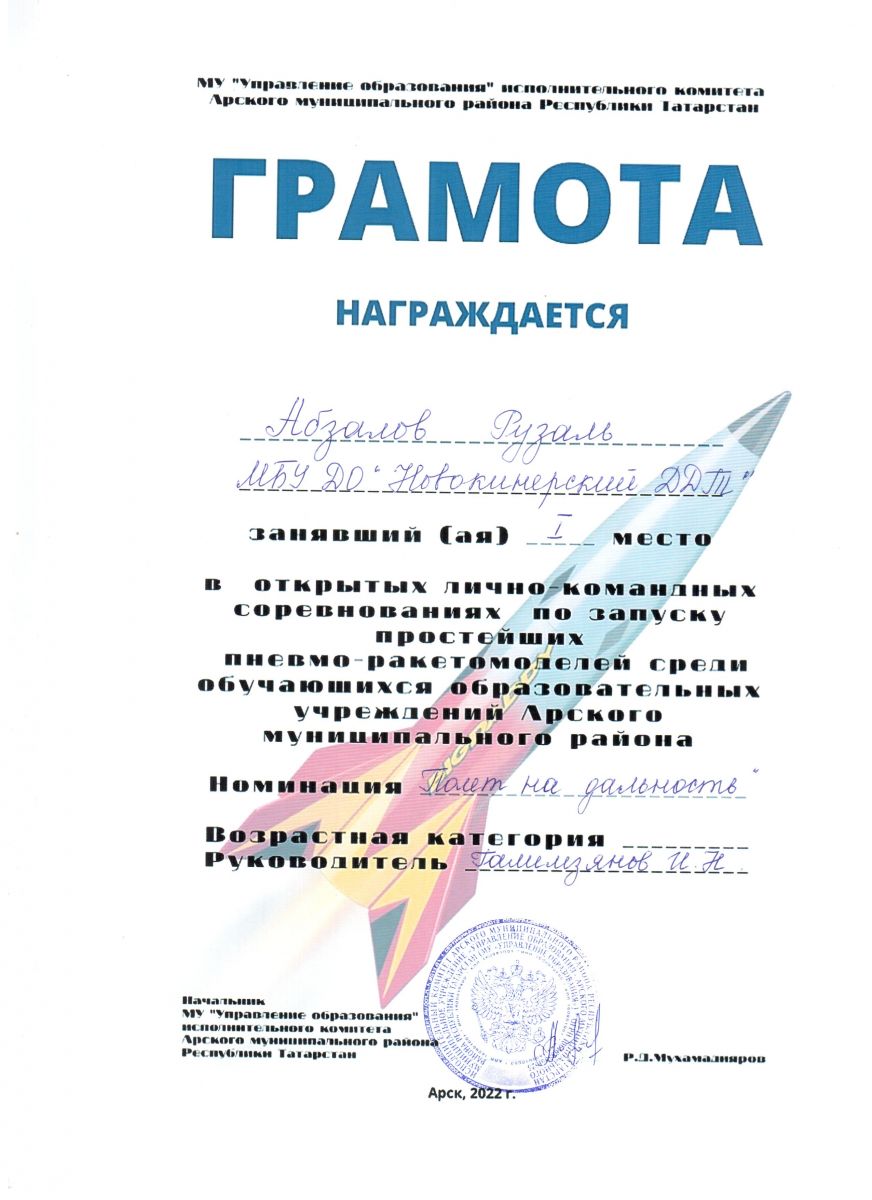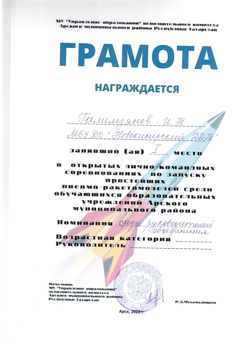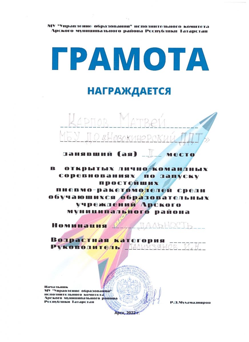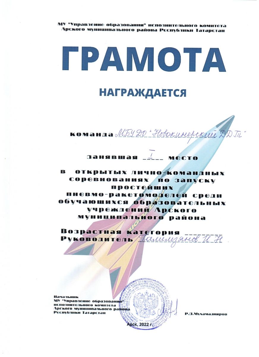 1 место - соревнования по запуску пневмо-ракетомоделей (команда)