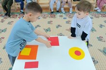 Дети младшей группы на занятии по познавательному развитию (математика) закрепили понятия "Большой, маленький, одинаковый", геометрические фигуры, сравнивали путем наложения.